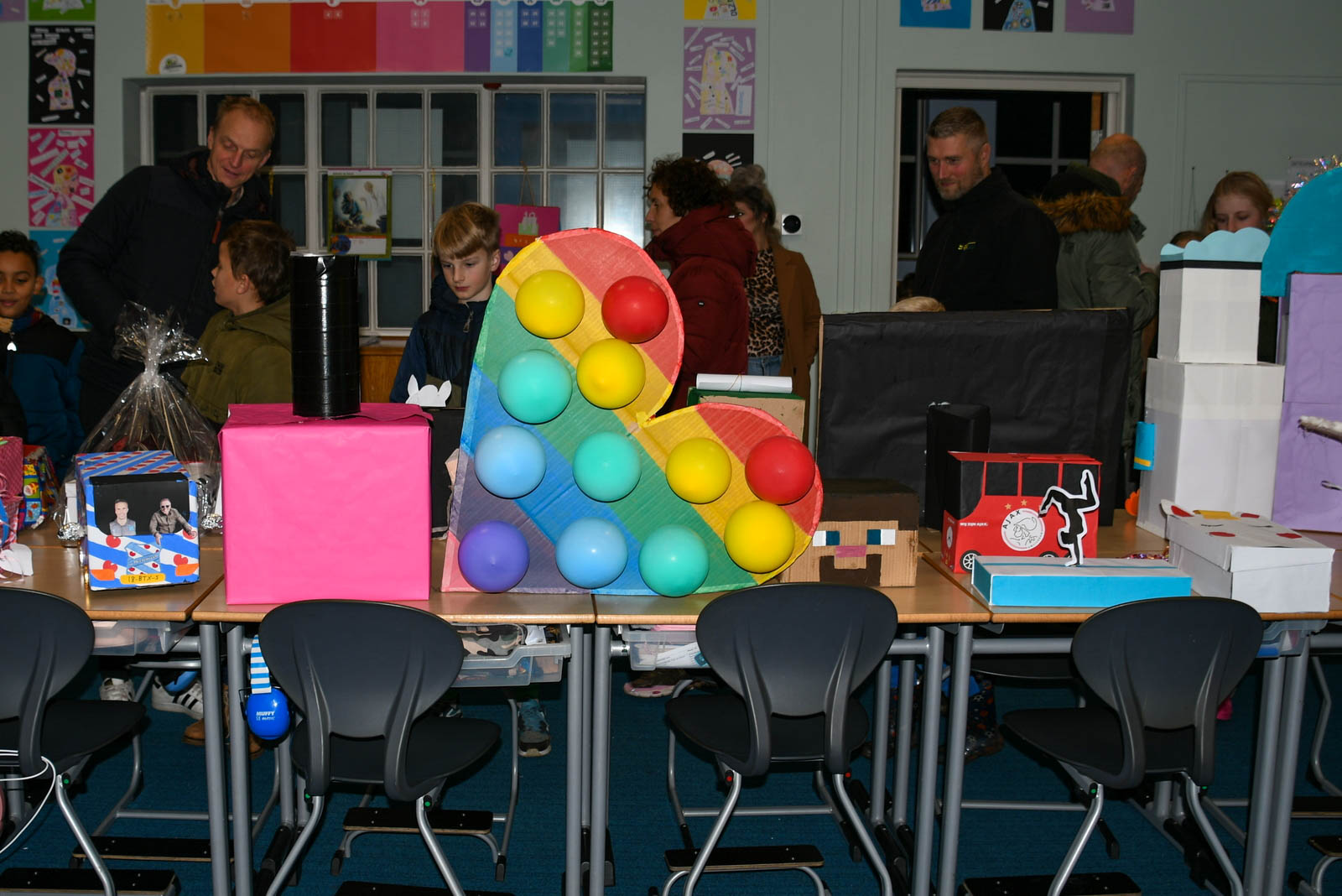Bijna drie weken geleden werden de lootjes getrokken, waarbij ieder een verlanglijstje invulde met kleine wensen. Aan de vooravond van 5 december stonden alle kunstwerken opgesteld in de klaslokalen, waar belangstellenden deze konden bewonderen. Het aanbod was overweldigend: surprises in alle soorten en maten, gemaakt met diverse technieken.