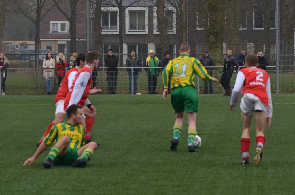 Mogelijk was arbiter Buiter zich er van bewust dat hij de gasten met een elfmetertrap rijkelijk had beloond. Drie minuten na de 2-1 was er een situatie waarbij een penalty veel meer op zijn plaats was geweest, toen Chris Hoeksma onderuit werd gelopen. Dit keer wuifde de leidsman het voorval weg. Hille Postma zocht op slag van rust het doel vanuit kansrijke positie nog een half metertje te hoog, nadat hij knap werd vrij gespeeld door Alex van der Tuin.