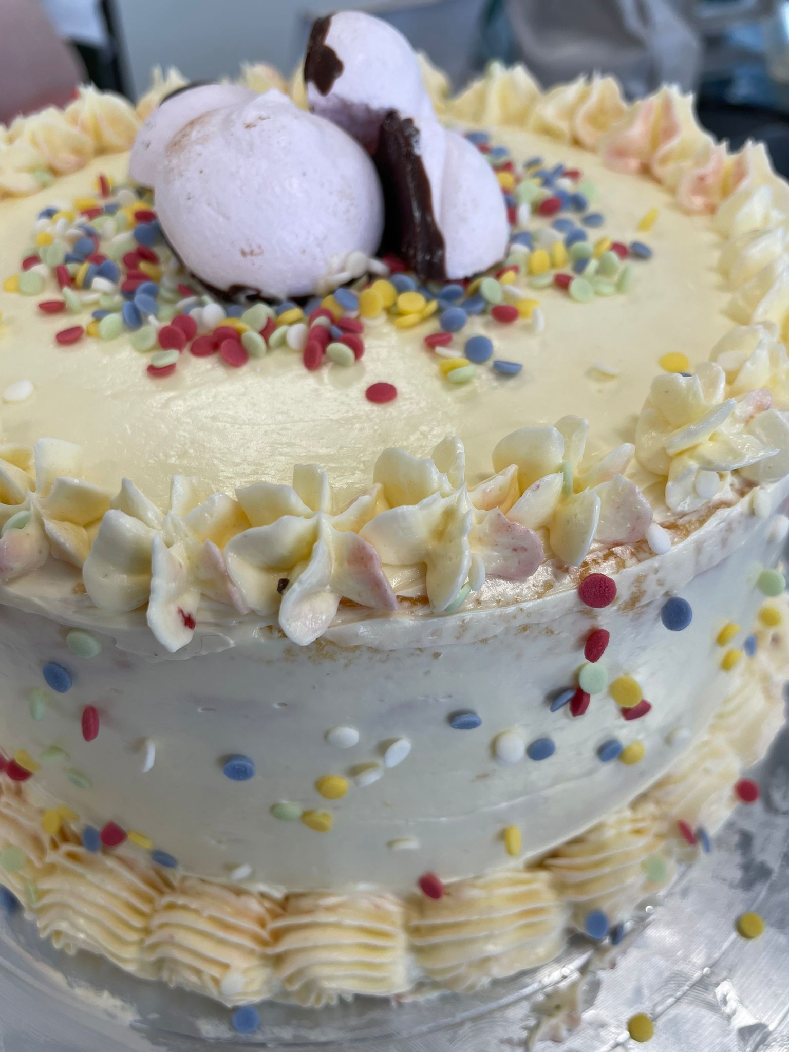 De leerlingen hadden er veel plezier in en waren 3 uren fanatiek bezig met de taarten. Een leerzame les over het banketbakkers vak. Ook wanneer het beslag even schift had Marianne daar een passende oplossing voor. Nooit weggooien maar de kom even afspoelen met warm water, weer mixen en dat een paar keer herhalen zal je botercrème redden. Het versieren van de taart was natuurlijk het mooiste om te doen. Oefenen met spuitzakjes en verschillende mondstukjes om zo de mooiste vormpjes te maken op je taart. Ze kijken terug op een prachtige ochtend.