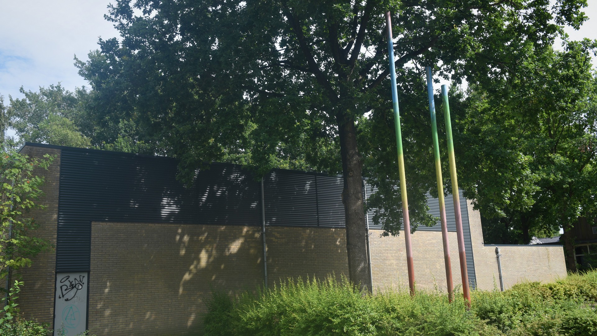 SUMAR/DAMWOUDE – Op het betegelde plein voor Dorpshuis De Kamp, Knilles Wytsewei 15 Sumar, reikt ‘De betekenis van kleur’ met palen naar de kroon van een boom. Het ranke meerkleurige kunstwerk is gecreëerd door fotograaf, schilder, beeldhouwer en monumentaal vormgever Wybe Bosch. Het abstracte werk bestaat uit drie stalen palen en dateert uit 1980.