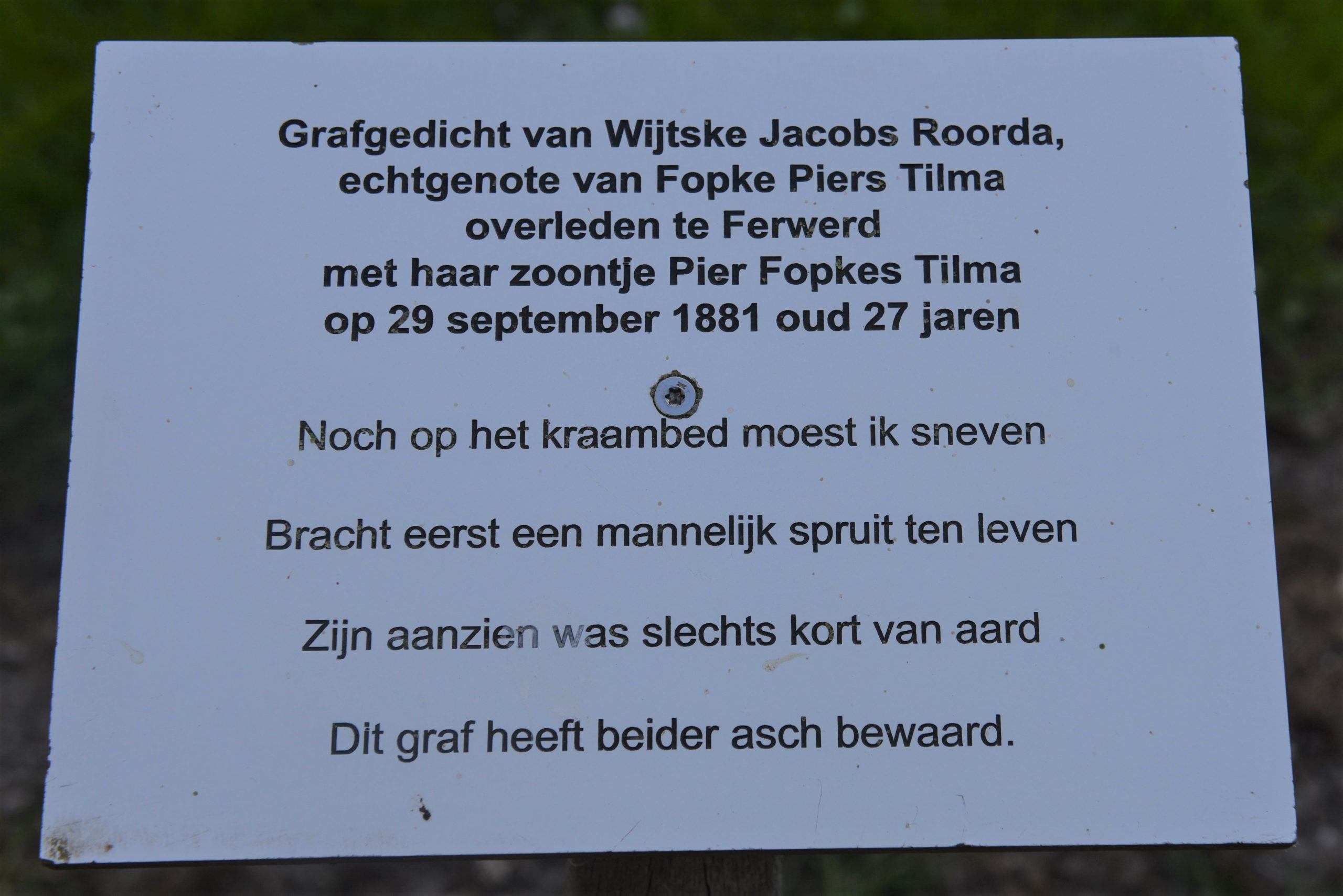 FERWERT – Een gedichtenroute in de openbare ruimte heeft vaak een bij de omgeving passend thema, zoals de gedichtenroute rond het kerkhof van de Martinuskerk in Ferwert. Aan een smal rond pad met uitzicht op de hof staan witte bordjes met troostrijke grafgedichten uit de negentiende eeuw ter ere van geliefde moeders, vaders en kinderen. Gerhild van Rooij