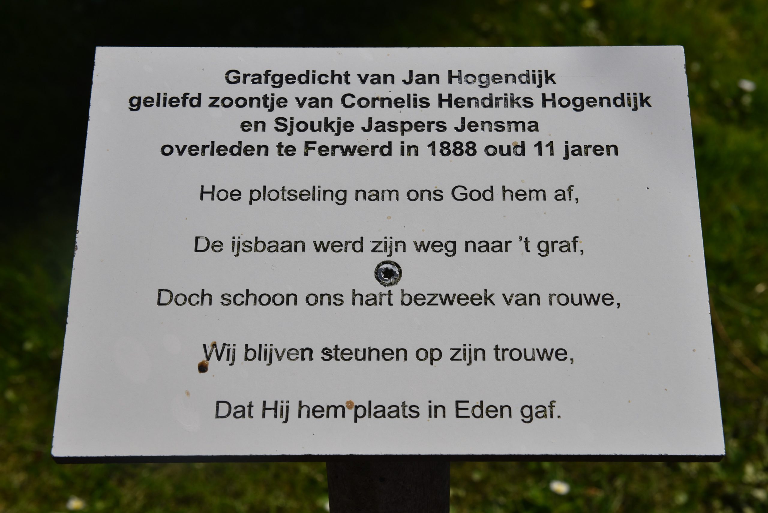 “Jan Hogendijk geliefd zoontje van Cornelis Hendriks Hogendijk en Sjoukje Jaspers Jensma overleden te Ferwerd in 1888 oud 11 jaren
