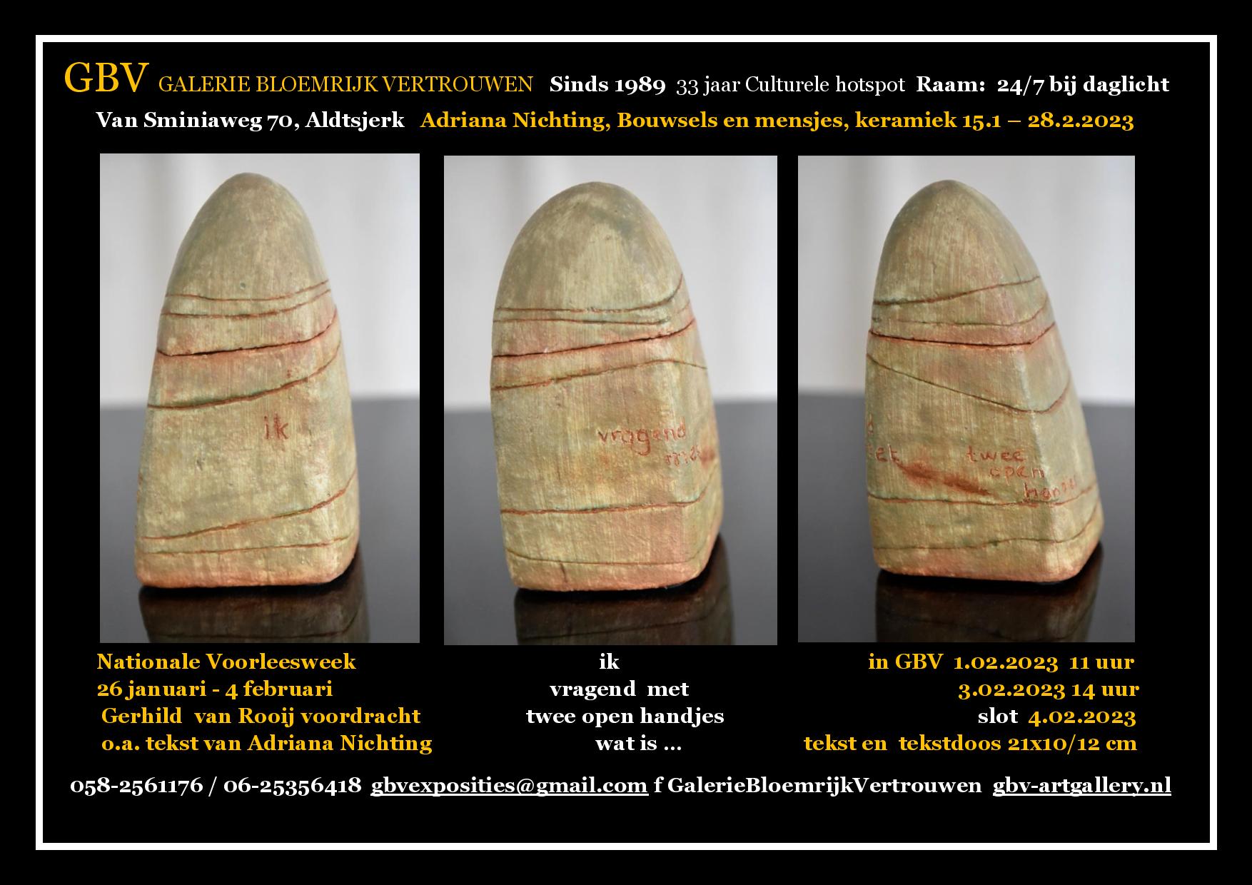 ALDTSJERK – Galerie Bloemrijk Vertrouwen houdt tijdens Poëzie-/Voorleesweken traditioneel bijeenkomsten voor vaste galeriebezoekers en kunstenaar-schrijvers die poëzie en beelden ineenweven. Het poëzieweekthema 2023 is Vriendschap. GBV opende de bijeenkomsten met een briefcitaat over vriendschap van Jentsje Popma (1921-2022) en op Voorleesdagen met een ‘voorstel’ naamgedicht uit Een Waging Pogen van Erik de Boer (Drachten, 1991).