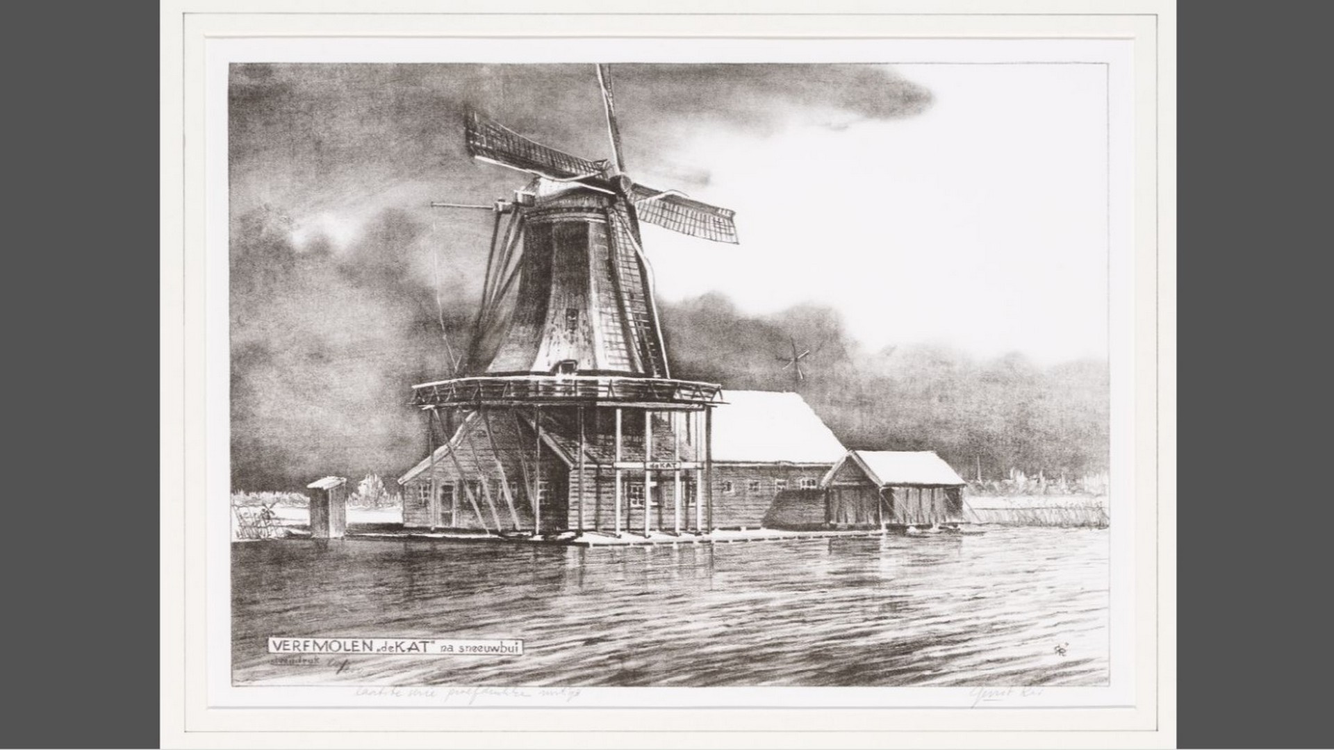 1. Gerrit Ris, VERFMOLEN DE KAT na sneeuwbui, steendruk 0/200, laatste serie proefdrukken, mrt ’93 (collectie Zaansche molen, inventarisnummer 0003441, https://beeldbank.zaanschemolen.nl/beelden/).