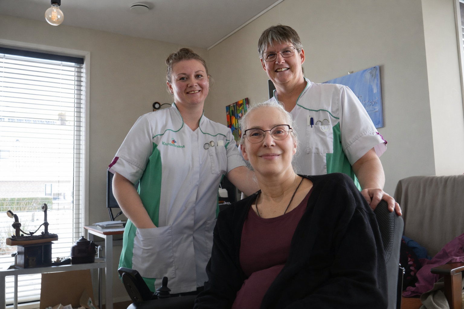 Ook cliënt Antsje benadrukt hoe belangrijk de komst van de thuiszorg is, juist bij slecht weer. “Dan wurdt myn soarch net jûn en sit ik miskien wol trije dagen yn in wiet broekje,” legt ze uit. “Ik fyn it geweldich en ha echt respekt foar de froulju.”