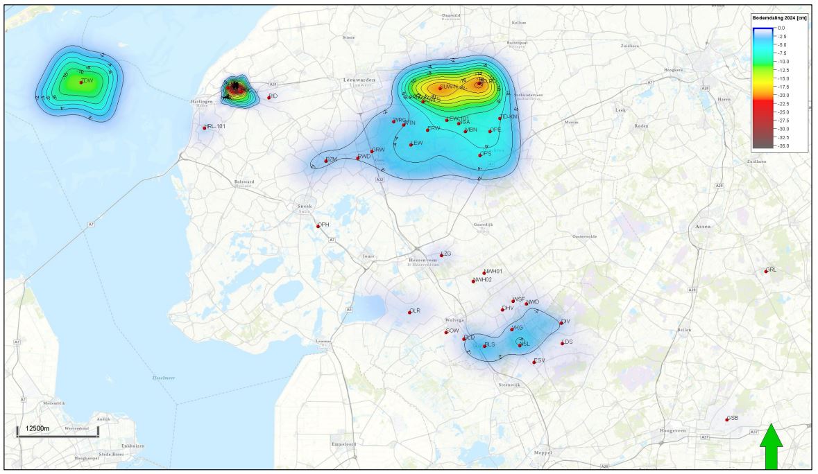 Deze cijfers zijn afkomstig uit het Bodemdaling Statusrapport 2024 van Vermilion, waarin kaartmateriaal en metingen op basis van GPS en waterpassingen zijn opgenomen.