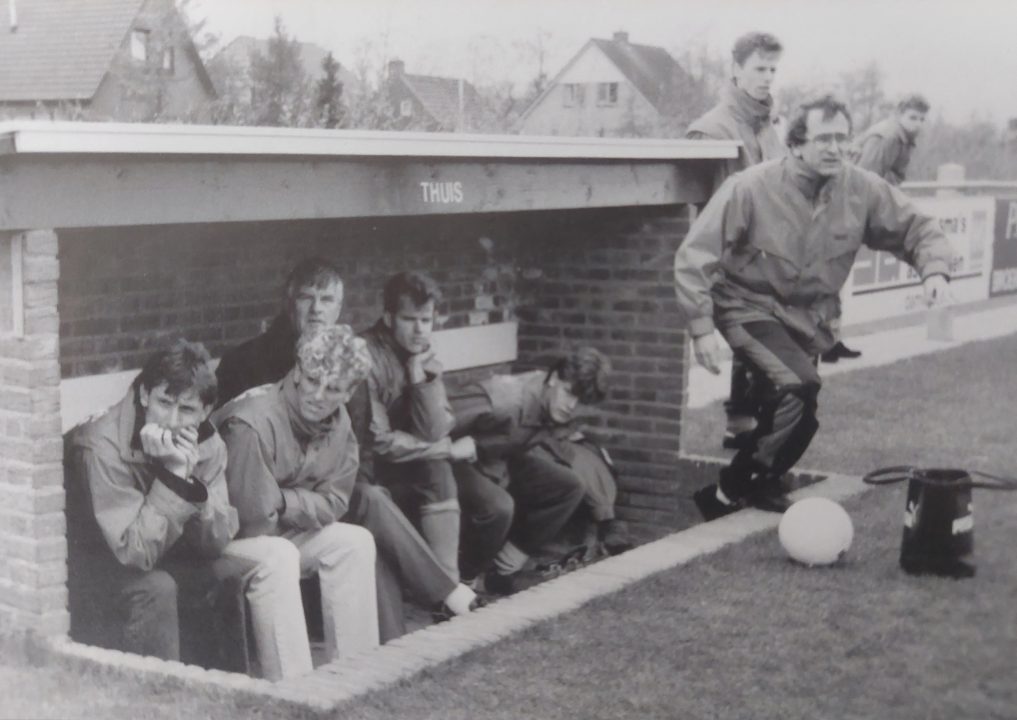 Een vertrouwd beeld bij Broekster Boys aan het einde van de jaren ’80: Pier Sienema in de dug-out. Van links naar rechts: Jan Schulting, Jouke Faber, Pier Sienema, Sjoerd Jan Eppinga en Sipke van der Meulen. Verzorger Jan Klaver staat in de startblokken om een blessure te verzorgen.