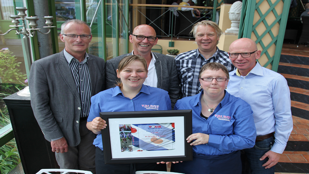 Achterste rij vlnr: wethouder Klaas Antuma, teammanager Dries van Kalsbeek, Lammert de Vries (Tour Culinair) en Ton Lenting (Tour Culinair).