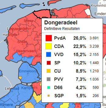 Kijk hier voor de (voorlopige) uitslagen van de Tweede Kamerverkiezingen op 12 september 2012 in de regio Noordoost Friesland. De gemeente Dongeradeel had als een van de eerste gemeenten van Nederland de resultaten binnen. De PVDA is de grootste partij in de gemeente geworden. Voorheen was dat het CDA. Ook in de andere gemeenten in het RTV NOF uitzendgebied is de partij van Diederik Samsom de grootste geworden. In Kollumerland c.a. was de opkomst lager als in Dongeradeel en Dantumadiel.