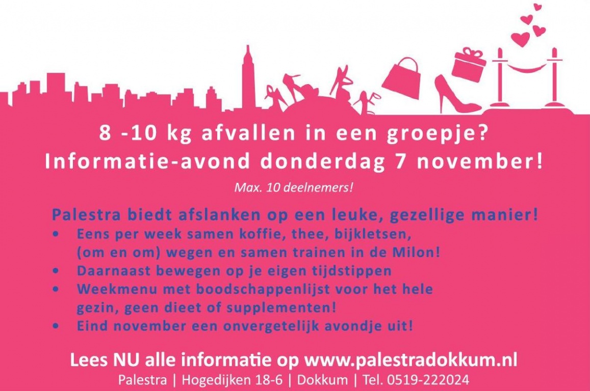 Op donderdag 7 november organiseert Palestra een informatie-avond waarbij de cursus wordt uitgelegd. Iedereen is welkom om te komen luisteren, via de website www.palestradokkum.nl kunt u u opgeven. Het unieke aan deze cursus is dat er een ‘resultaatgarantie’ is. Houd de deelnemer zich aan alle afspraken maar is de deelnemer na afloop niet tevreden over het resultaat? Dan krijgt zij haar geld terug! Tenslotte gaat de afslankgroep nog een hele leuke avond tegemoet: op 30 november as. gaan zij naar de Smart & Sexy theatershow van Lisa Portengen. Deze show is een mix tussen de Oprah Winfrey talkshow & theater met bijzondere inzichten, kadootjes, muziek, kippenvel en volop inspiratie die de deelnemers van de afslankgroep zal helpen om hun 14 weekse project vol te houden. Alle dames uit Dokkum en omstreken zijn van harte uitgenodigd!