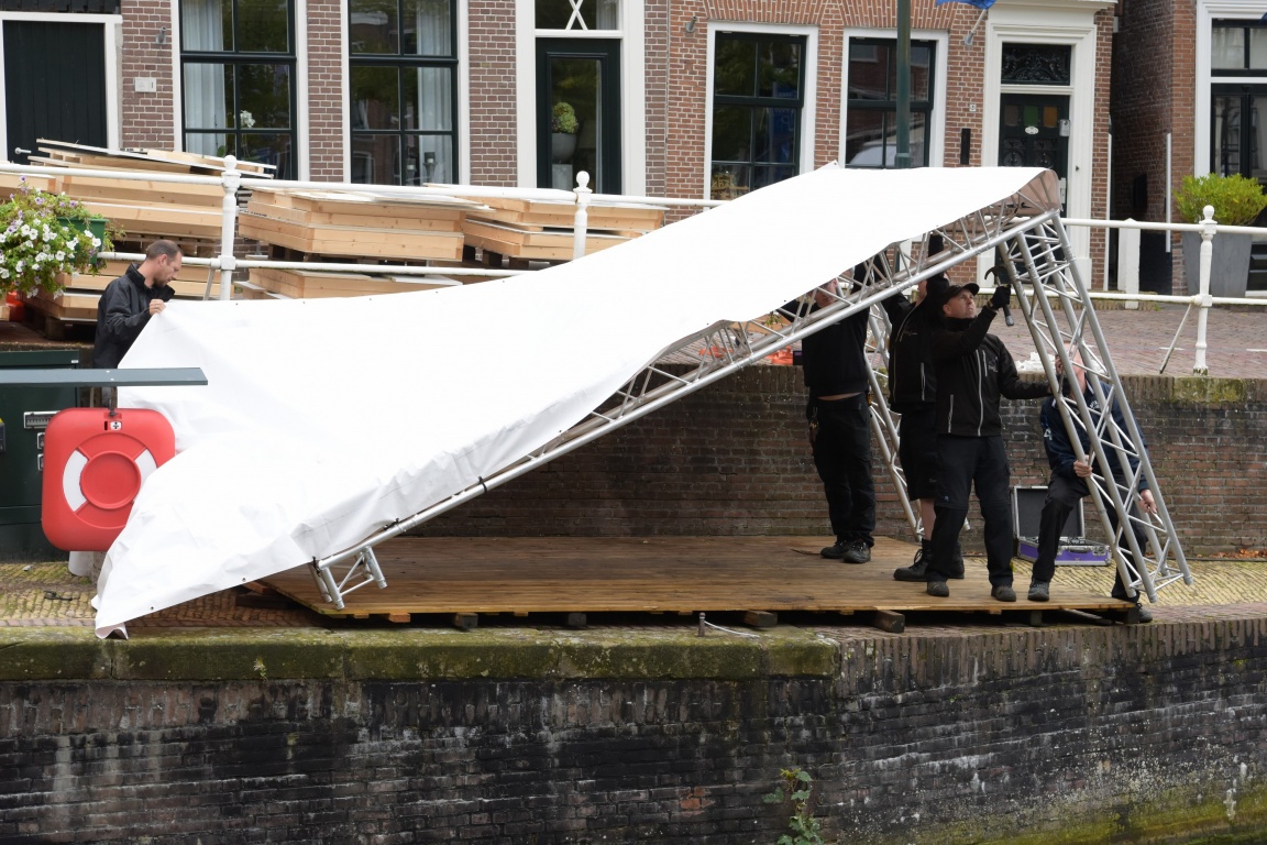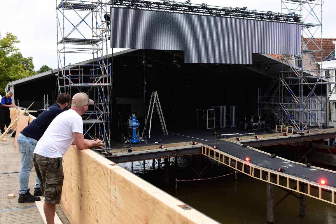 Al een week lang is er gebouwd aan het unieke podium voor de 7de editie van de Admiraliteitsdagen van Dokkum. Vorige week zijn de aannemers uiteengezet met het plaatsen van de zinken pontons en het leggen van het frame. Vrijdag werden de vloerplaten en de overkapping geplaatst. Deze week zijn de steigerbouwers begonnen met de torens voor het beeld en geluid. Dit podium is speciaal voor de Admiraliteitsdagen ontworpen door Adema Architecten in samenwerking met Ensel Staalconstructies, Bouwgroep Dijkstra Draisma en Kuipers Waterwerken, Probo Sign levert de doeken voor de torens die het beeld en geluid dragen, zodat alles een mooi geheel wordt.
