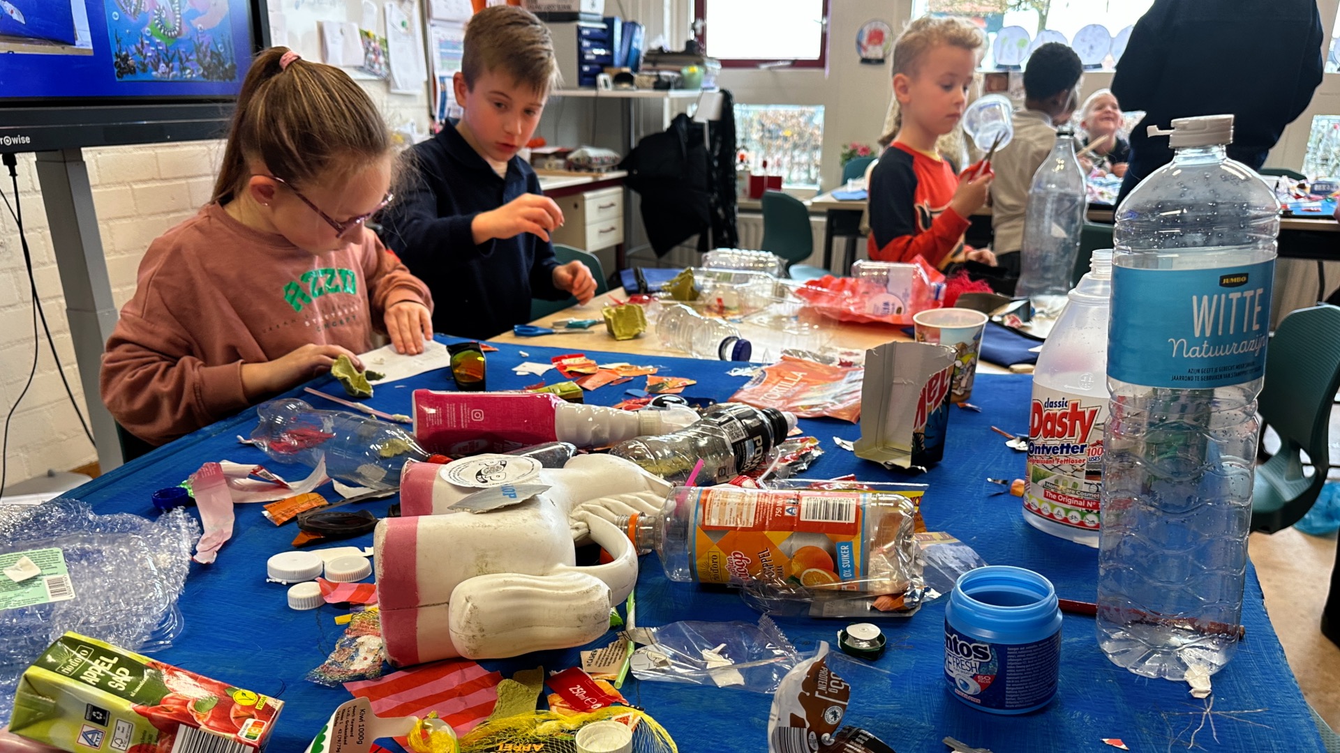 Vorige week, op donderdag 15 januari, kregen de leerlingen eerst een presentatie over afval: wat het is, waar het vandaan komt en hoe het via rivieren uiteindelijk in zee terecht kan komen. Ook werd stilgestaan bij de gevolgen van afval voor dieren en het milieu. Kingma zag hoe betrokken de leerlingen waren: “Se fûnen it hiel leuk alle filmkes dy’t we se foarige kear sjen litten ha, mar it alderleukste fine se fansels om no te knutseljen.”