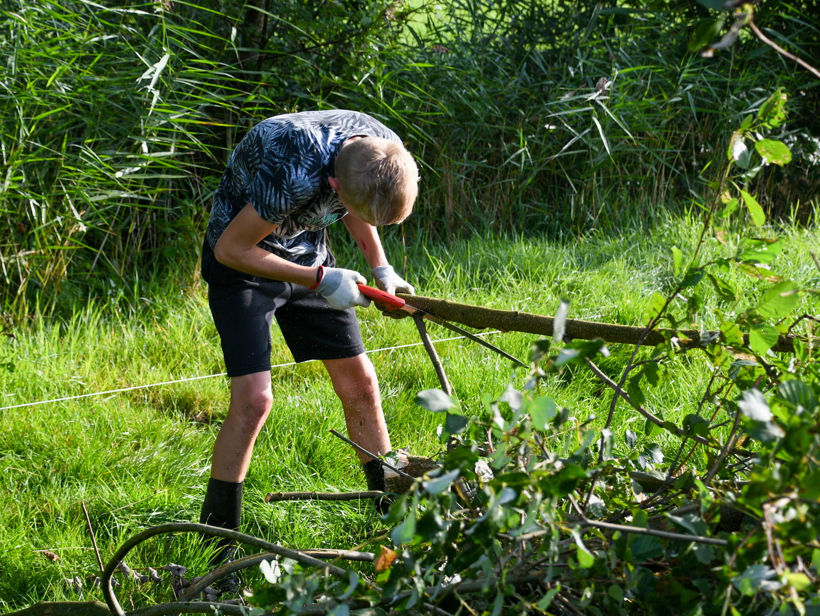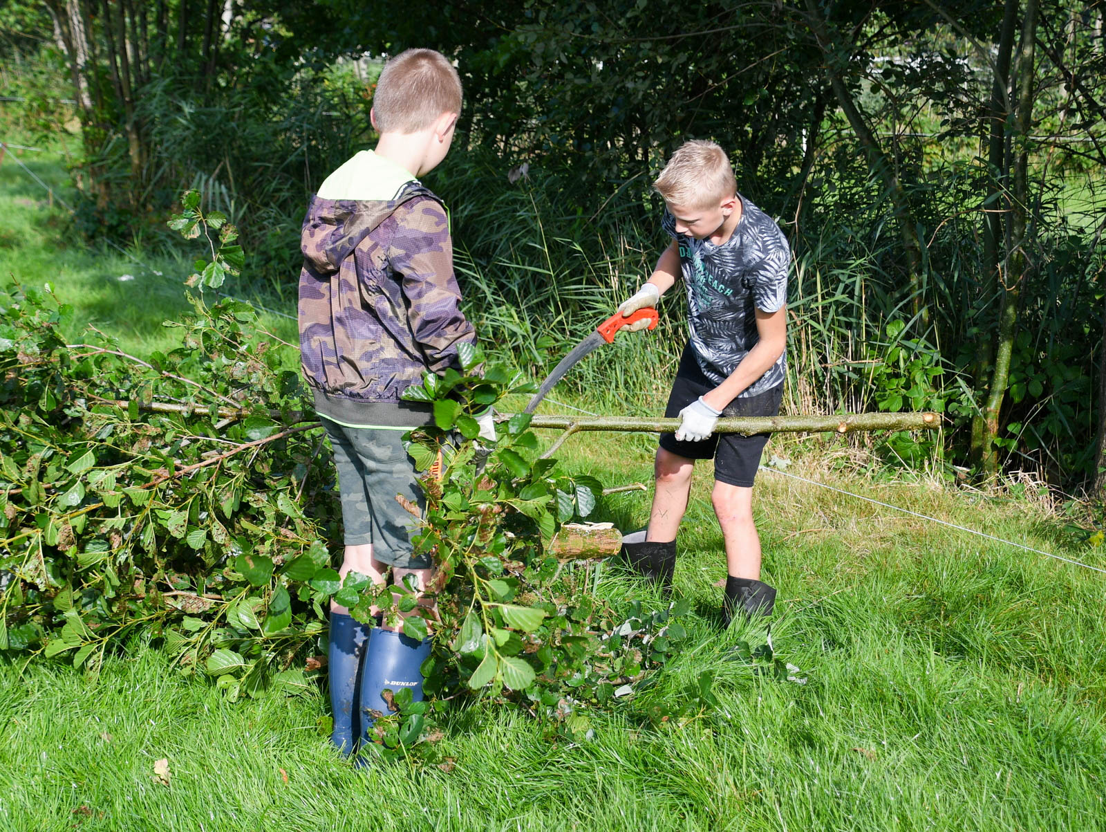 Een ander groepje ging met Oege Hiddema van de Noardlike Fryske Wâlden mee om te snoeien (en dus onderhouden) van de houtwallen. Hierbij moesten de kinderen takken die te lang werden of over de sloot hingen, wegsnoeien met zagen en knipscharen.