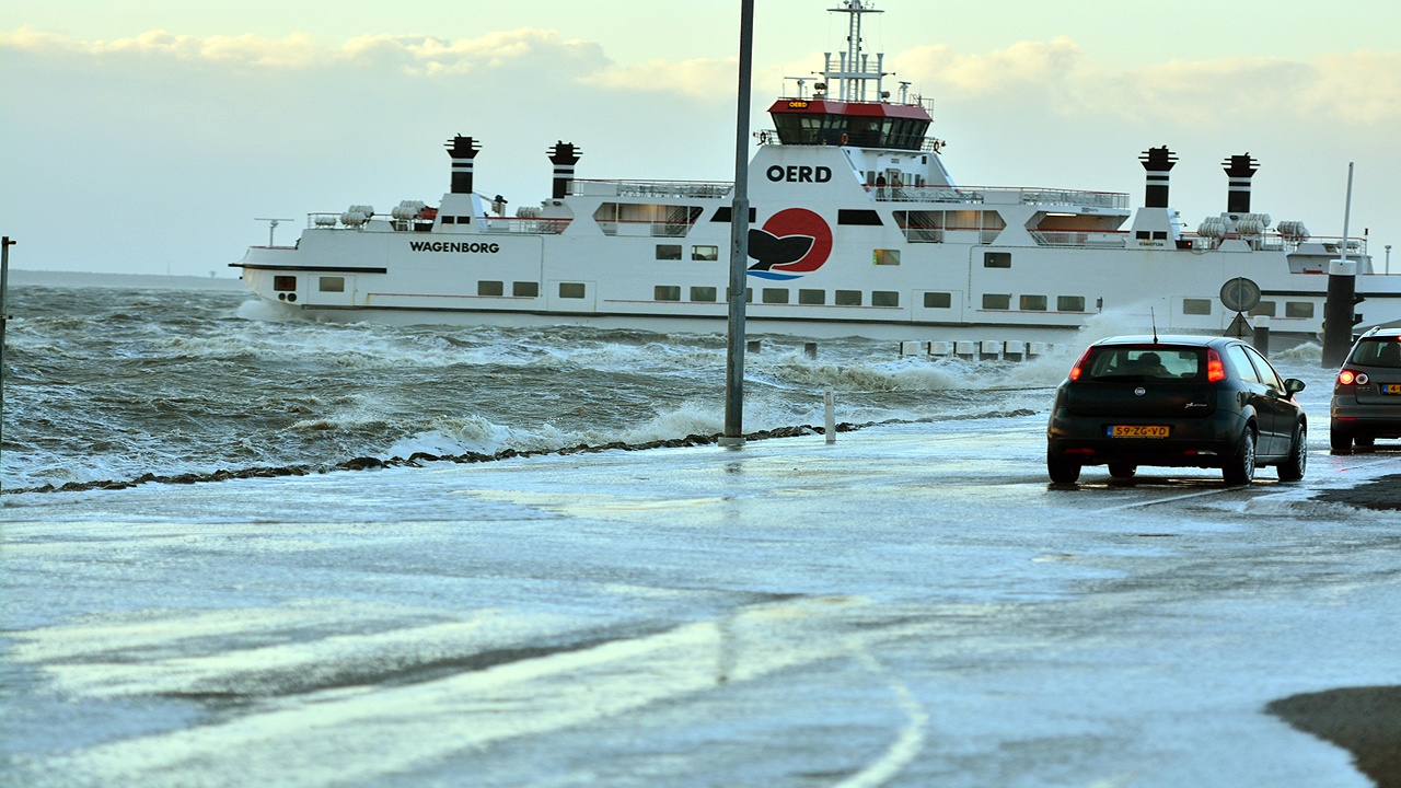 De stormachtige wind met zeer zware windstoten waar Nederland dindag mee te maken had, zorgde voor verhoogde waterstanden langs de kust en rond het IJsselmeer. Rijkswaterstaat sloot daarom de pier bij Holwerd. De verhoogde waterstand kon er toe leiden dat de pier en veerdam onderliepen.
