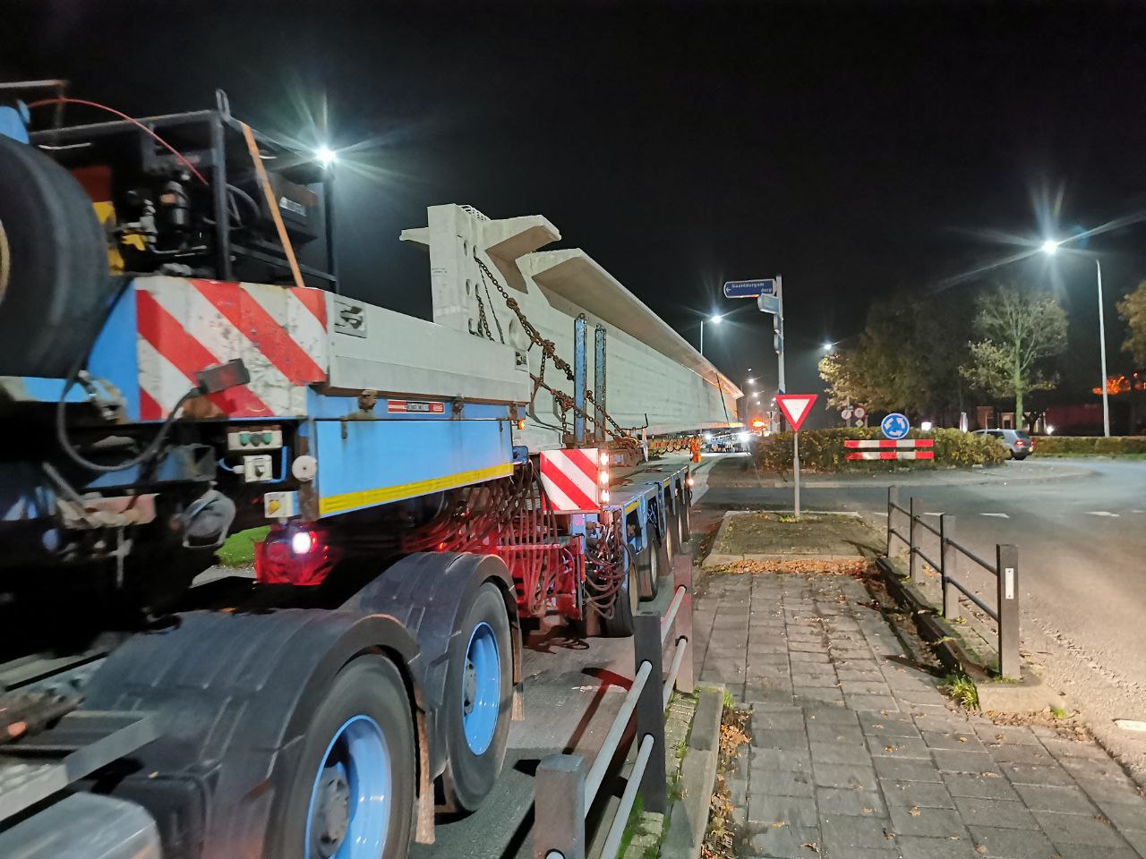 KOOTSTERTILLE – Maandagavond is er begonnen met een extra lange transport, het gaat hier om kokerliggers van 70 meter lang die vanuit Kootstertille bij Haitsma Beton naar Groningen gaan.