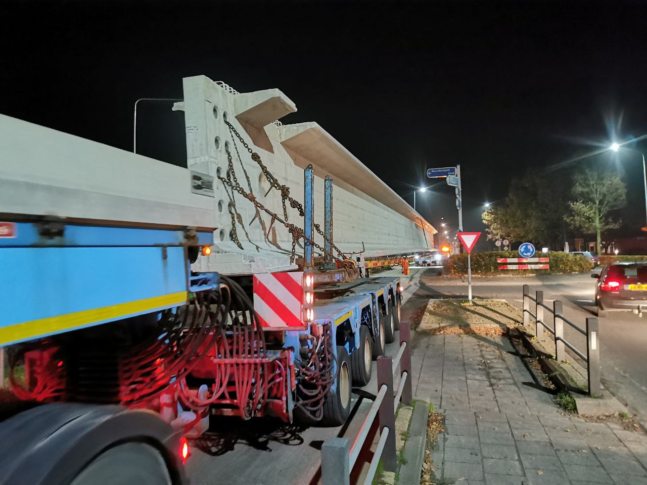 KOOTSTERTILLE – Maandagavond is er begonnen met extra lange transporten van kokerliggers, het gaat hier om kokerliggers van 70 meter lang die vanuit Kootstertille bij Haitsma Beton naar Kampen gaan. De liggers zijn bestemd voor de Roggebotsluis in Kampen.