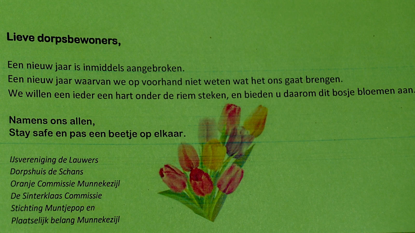Elke bewoner van Munnekezijl werd verrast met een bloemetje en kaartje met een boodschap ,,Dat er aan iedereen gedacht wordt, dat is onze belangrijkste boodschap” vertelt Lianne de Lange, Plaatselijk Belang Munnekezijl. Rond de 250 huishoudens mochten dit geschenk in ontvangst nemen.