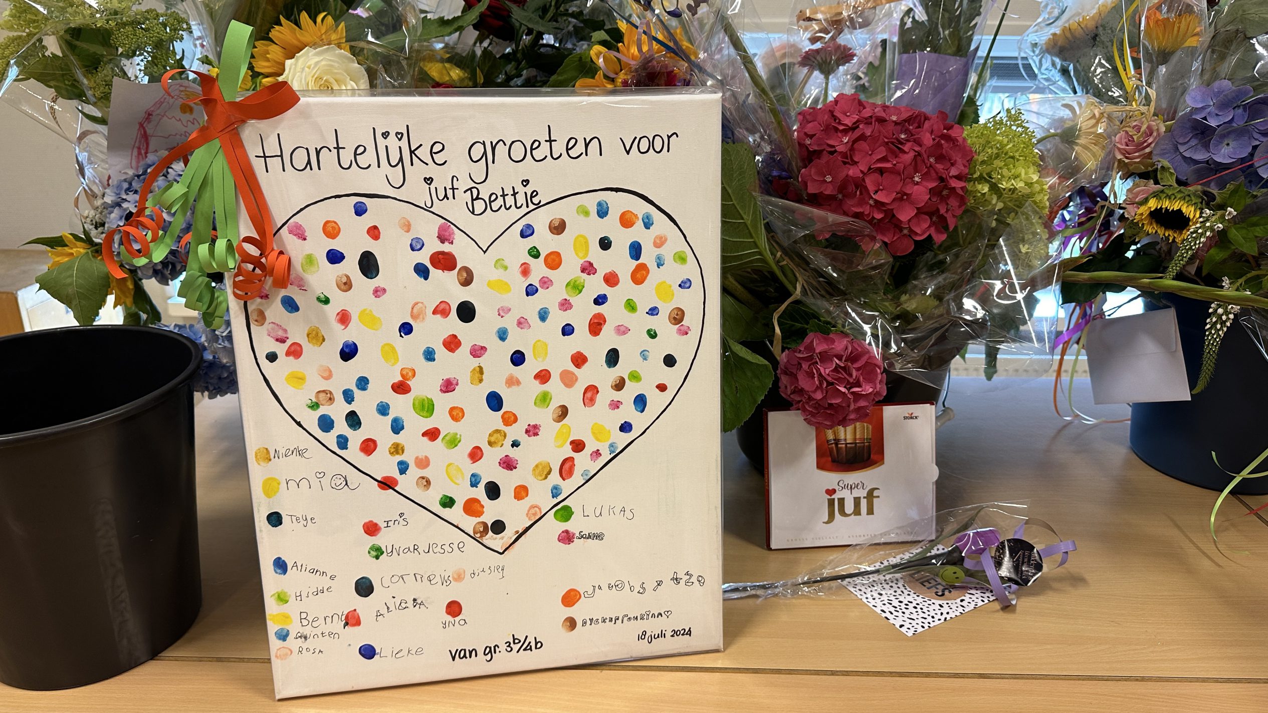 Sinds vorige week donderdag stond elke dag al in het teken van het afscheid van juf Bettie, met onder andere een leuke high tea met de leerlingen en een uitstapje met de collega’s. Maar daar bleef het niet bij, want donderdagochtend kwamen ouders, leerlingen, oud-collega’s en oud-leerlingen langs met bloemen en cadeaus om juf Bettie nog een keer te bedanken. “Ik kin it net omskriuwe, it is gewoan oerweldigjend en echt prachtich moai.” Tijdens het afscheid vielen er een aantal tranen, maar volgens juf Bettie waren het geen tranen van verdriet, maar alleen tranen van blijdschap.
