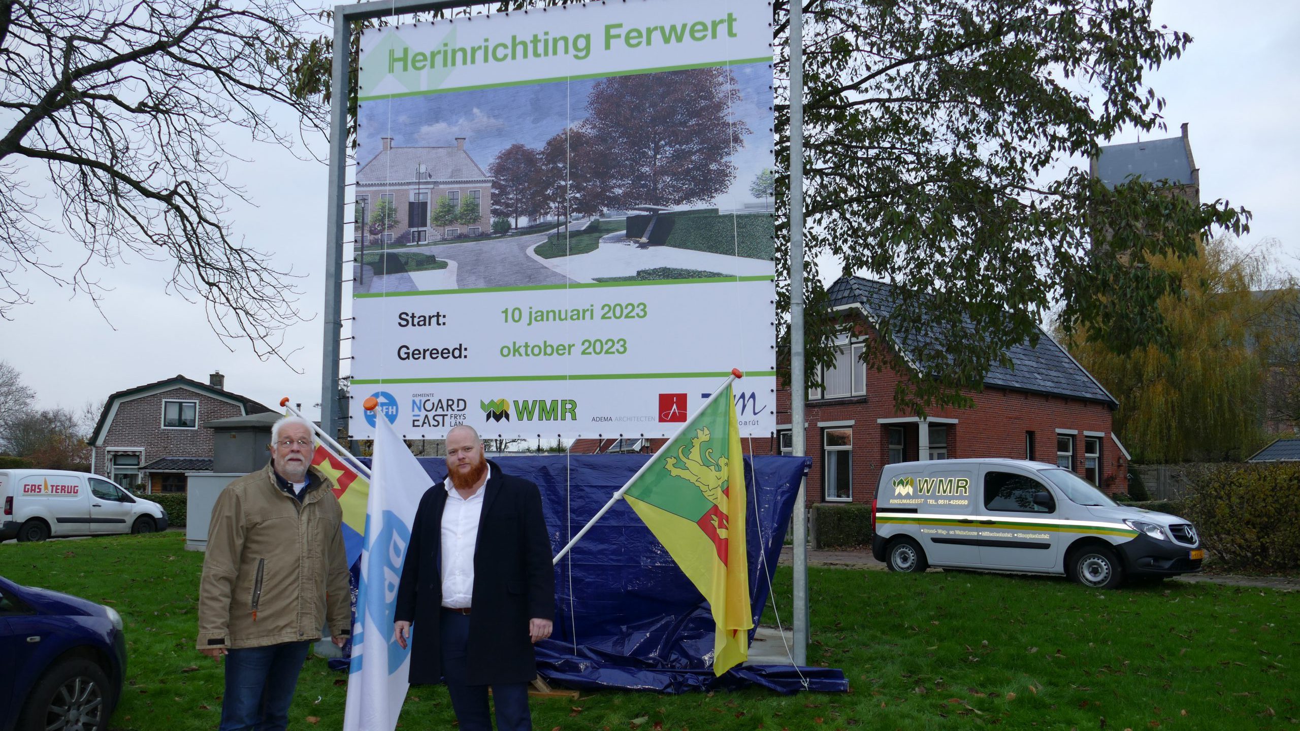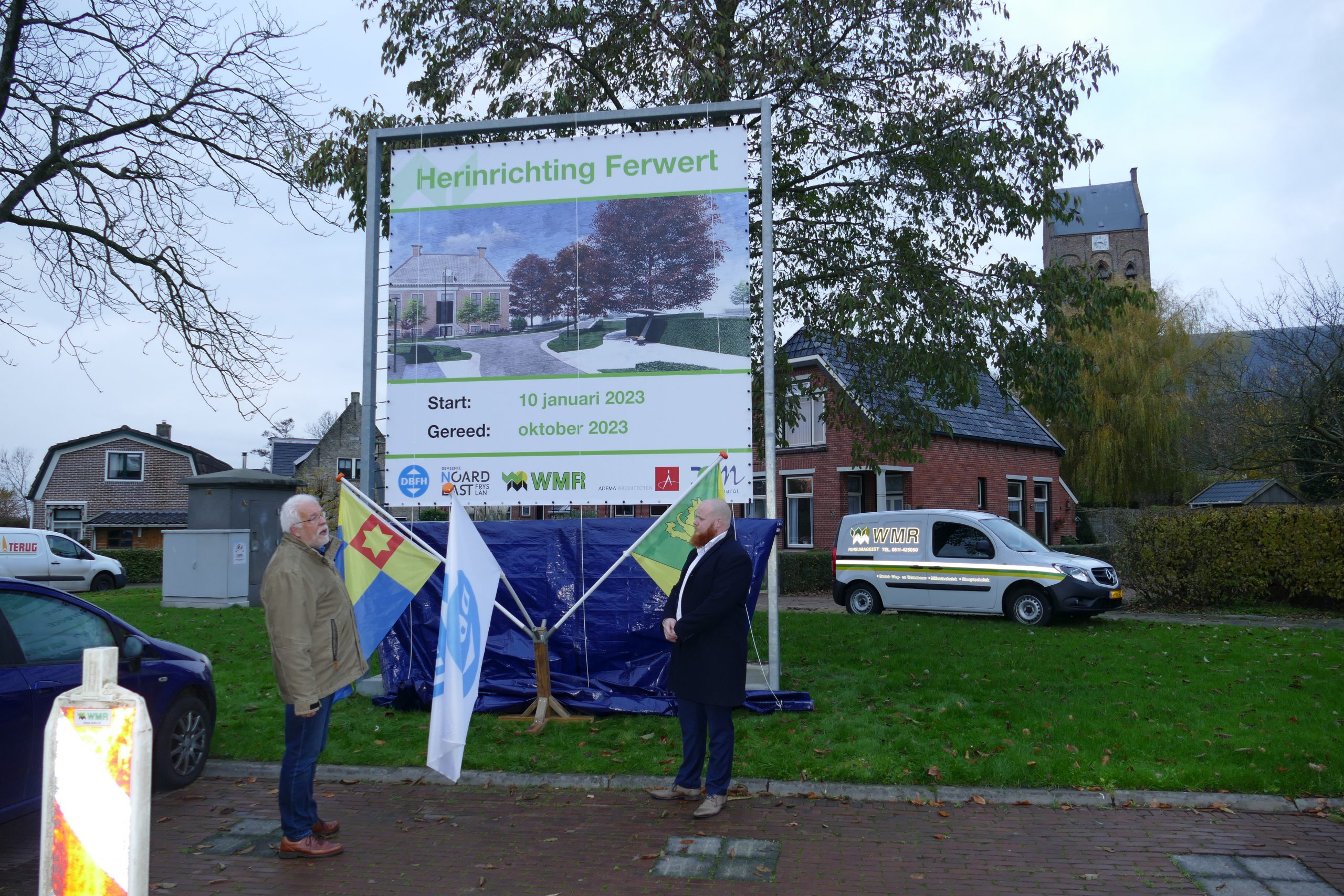 FERWERT – Door middel van het onthullen van een projectbord is de herinrichting van Ferwert officieel van start gegaan. Het bord werd onthult door Sjak Papma van de dorpsontwikkelingsmaatschappij (DOM) en wethouder Aant Jelle Soepboer.