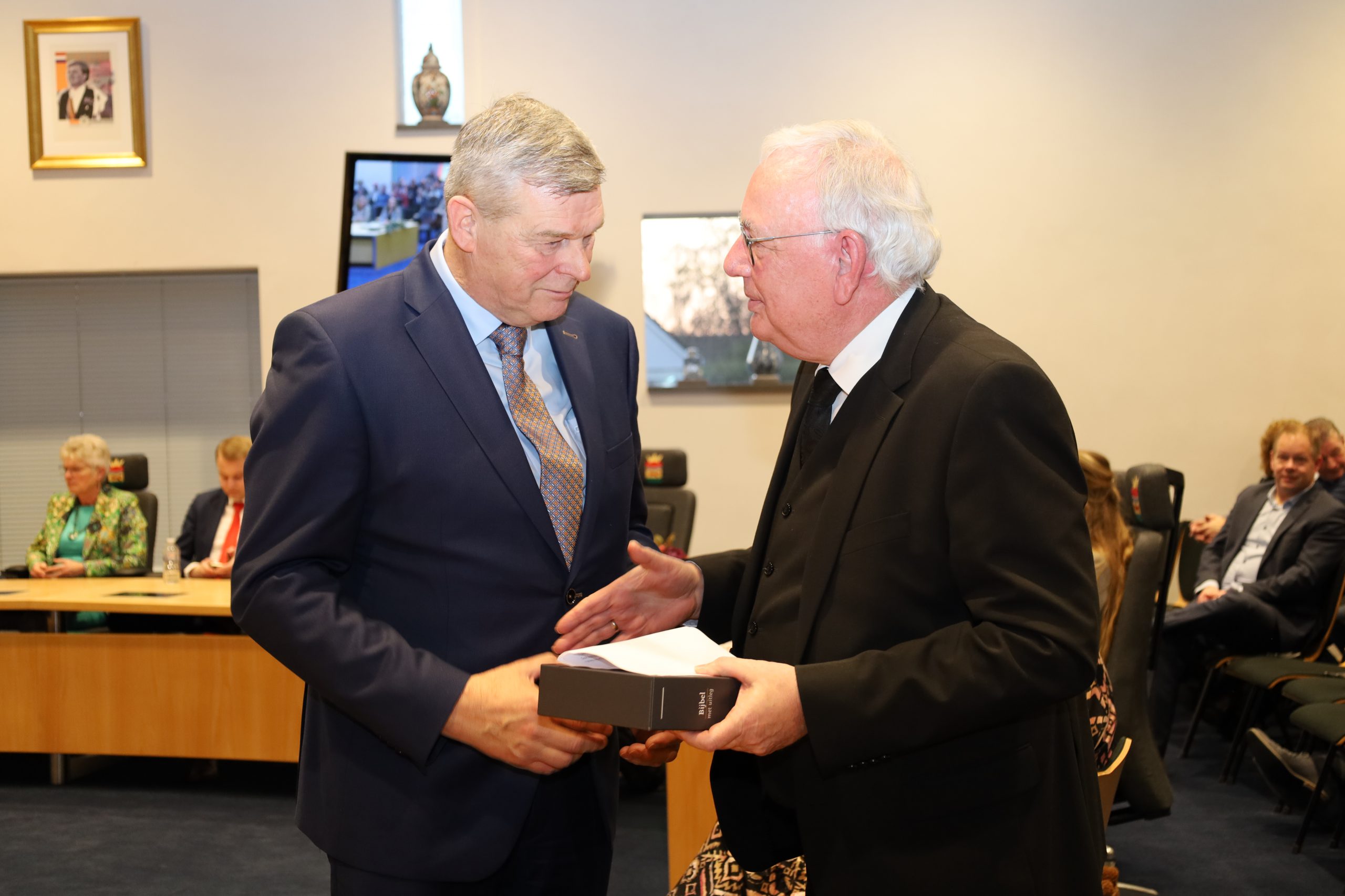 DAMWALD – Klaas Agricola is vrijdag 29 november, tijdens zijn afscheid als burgemeester van Dantumadiel, benoemd tot ereburger van de gemeente. Hij ontving de gemeentelijke erepenning als erkenning voor zijn grote inzet en betrokkenheid bij de inwoners en de dorpen van Dantumadiel.