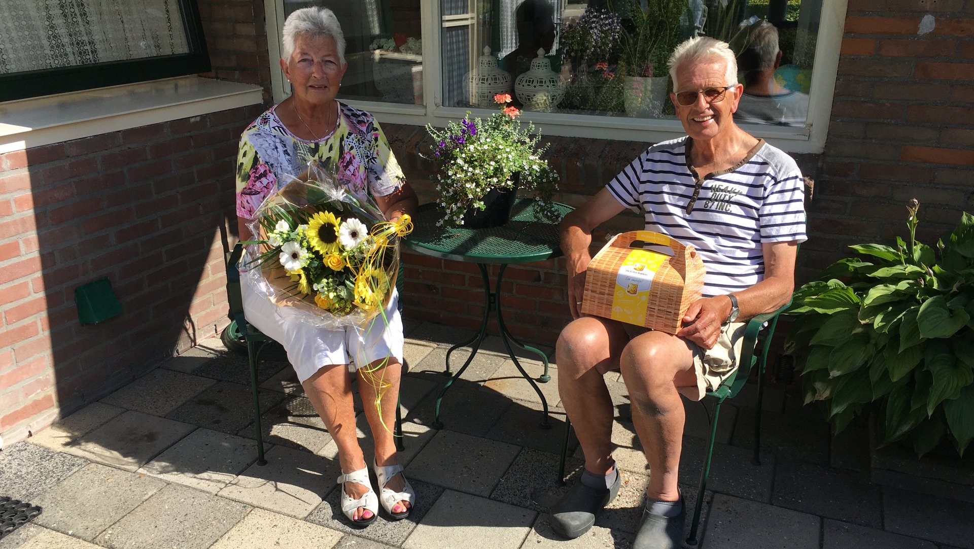 Dat Marten veel bezig is ondervond het reportageteam ook, hij was namelijk druk bezig in de tuin toen ze het pakket kwamen brengen. Het pakket bestond uit een bosje bloemen van Jilderda’s Bloemenboetiek en een ontbijtje van Echte Bakker Eddy de Jong. ,,Dit had ik helemaal niet verwacht, maar het is wel heel leuk”, zei Marten. Hij vertelde over de tuin die hij voor het dorpshuis onderhoud, samen met een paar buren. ,,We mogen dan zelf de vruchten hebben, maar je wilt het ook wat netjes houden”, aldus Marten.