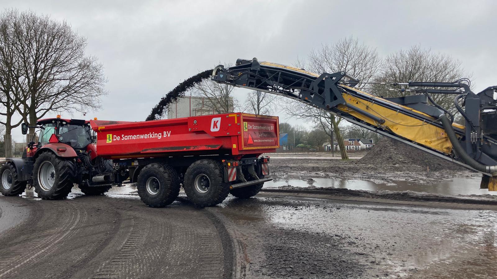 Het transferium is inmiddels klaar, maar een ander onderdeel van het project Kansen in Kernen is de aanleg van een park. Om ruimte voor dit park te maken, moet er nog één ding gebeuren, namelijk het verwijderen van de oude rondweg. Aan de hand van een asfaltfreesmachine wordt het asfalt verwijderd.