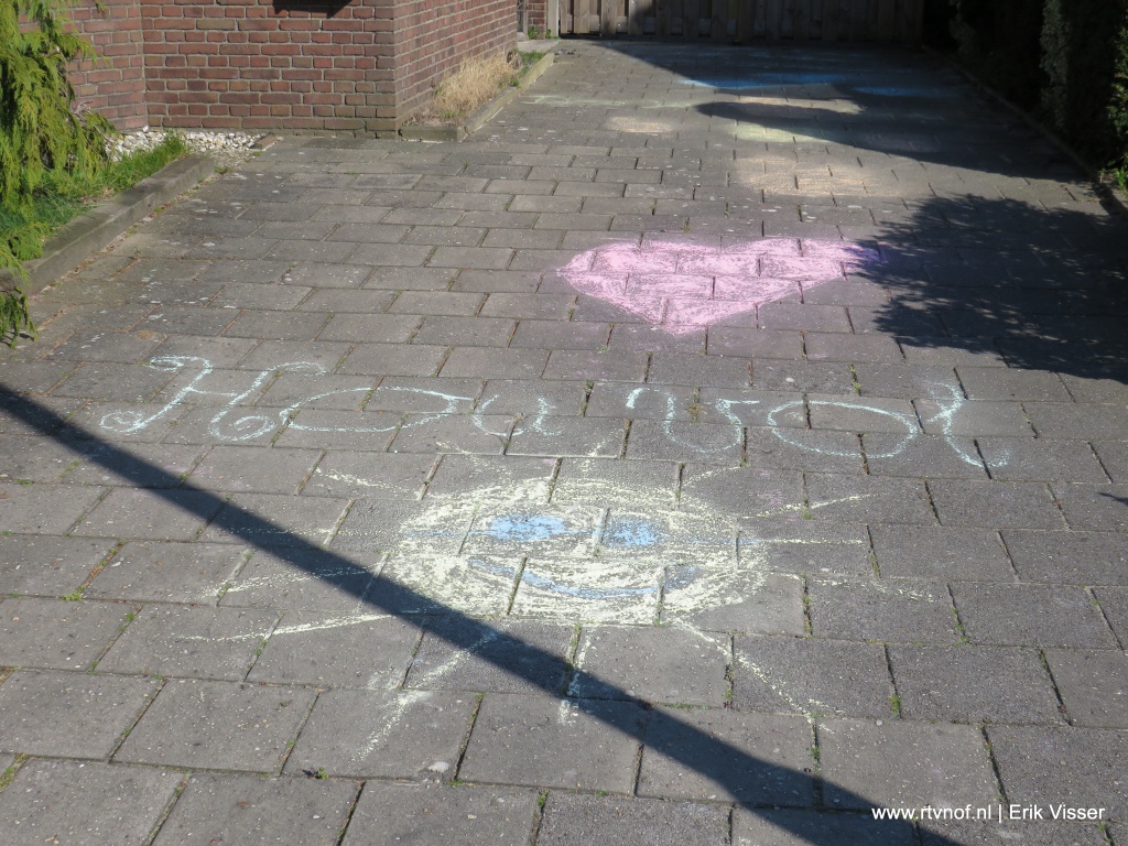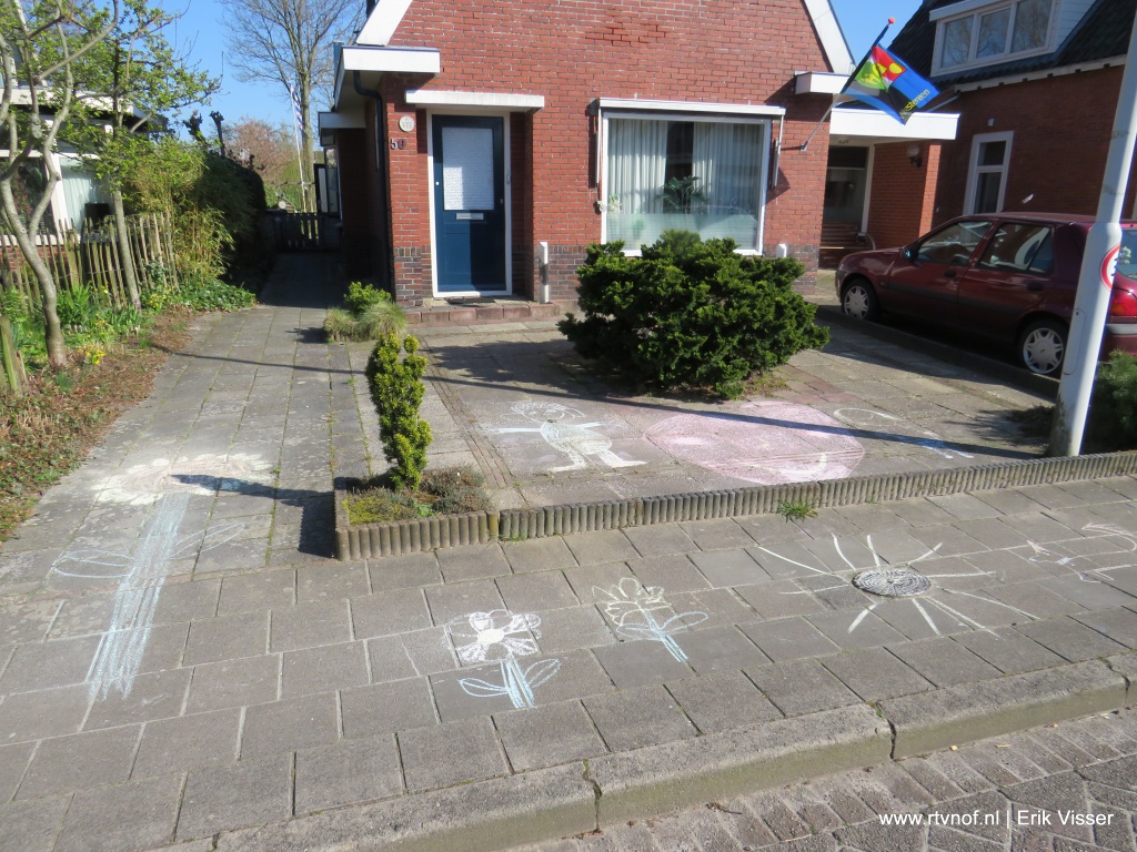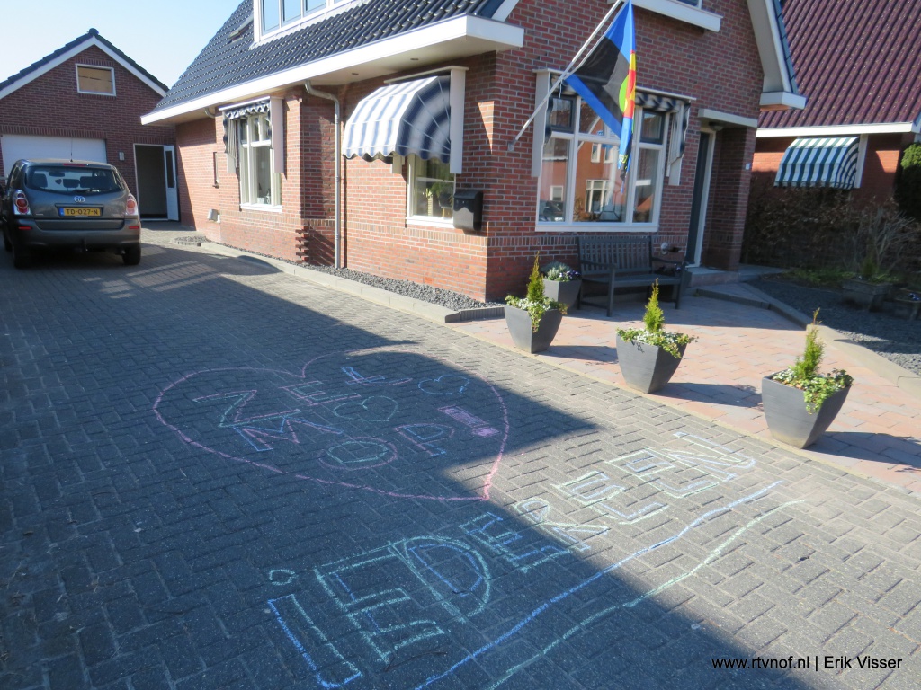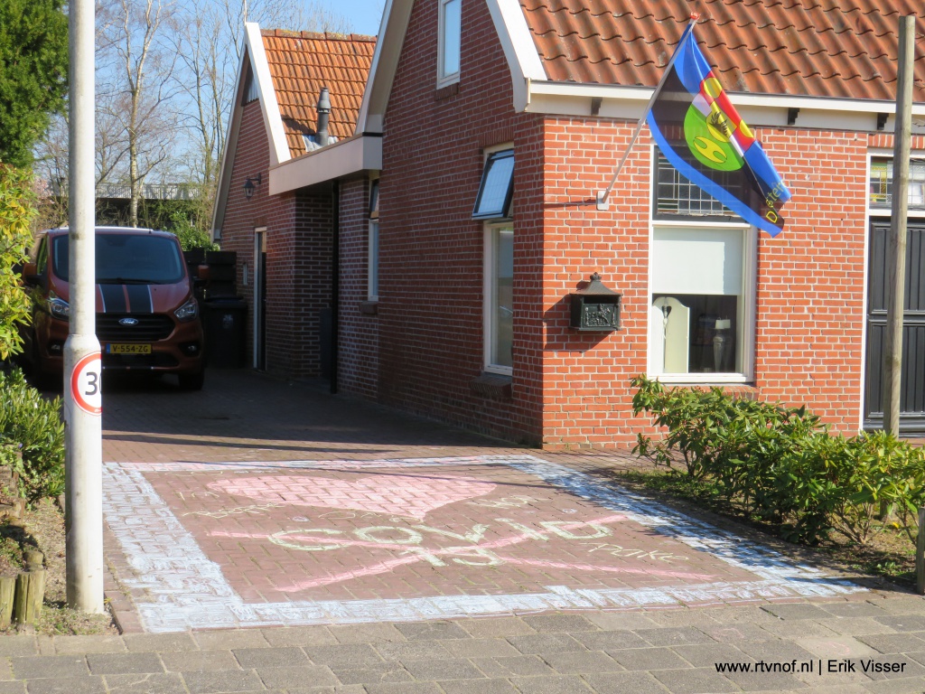 Afgelopen weekend kon iedereen van de Ferlinge Stasjonsstrjitte in De Westereen bij hun eigen woning hun stoep en opritten beschilderen of mozaïeken met stoepkrijt. Hierbij konden ze aan iedereen de groeten doen aan bijvoorbeeld pake en beppe, klasgenoten, coronapatiënten, zorgverleners of vrienden die nu geen bezoek kunnen ontvangen.