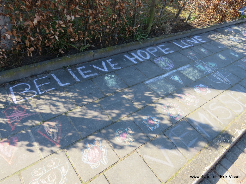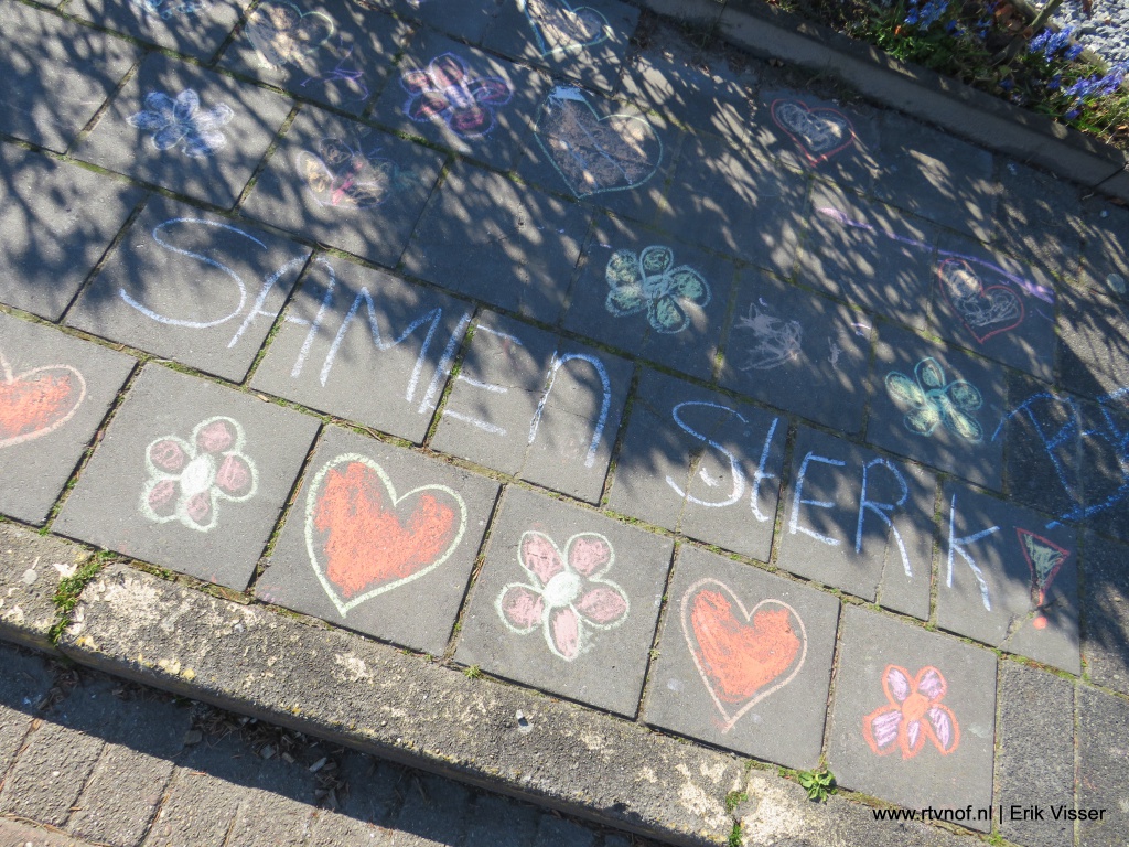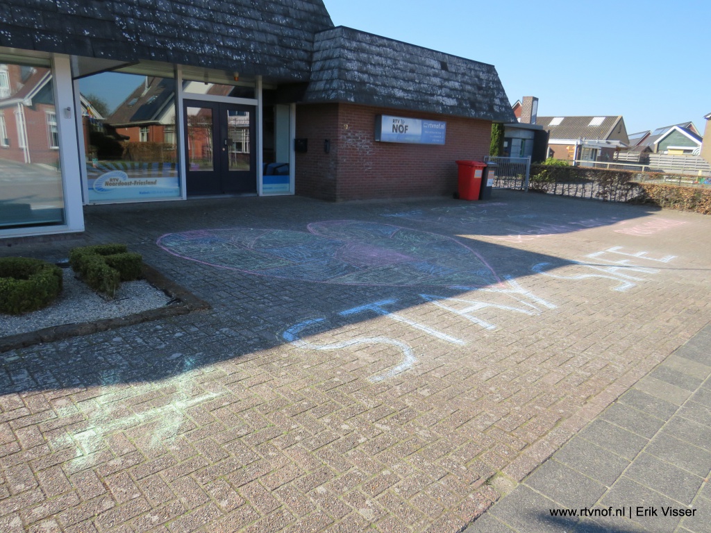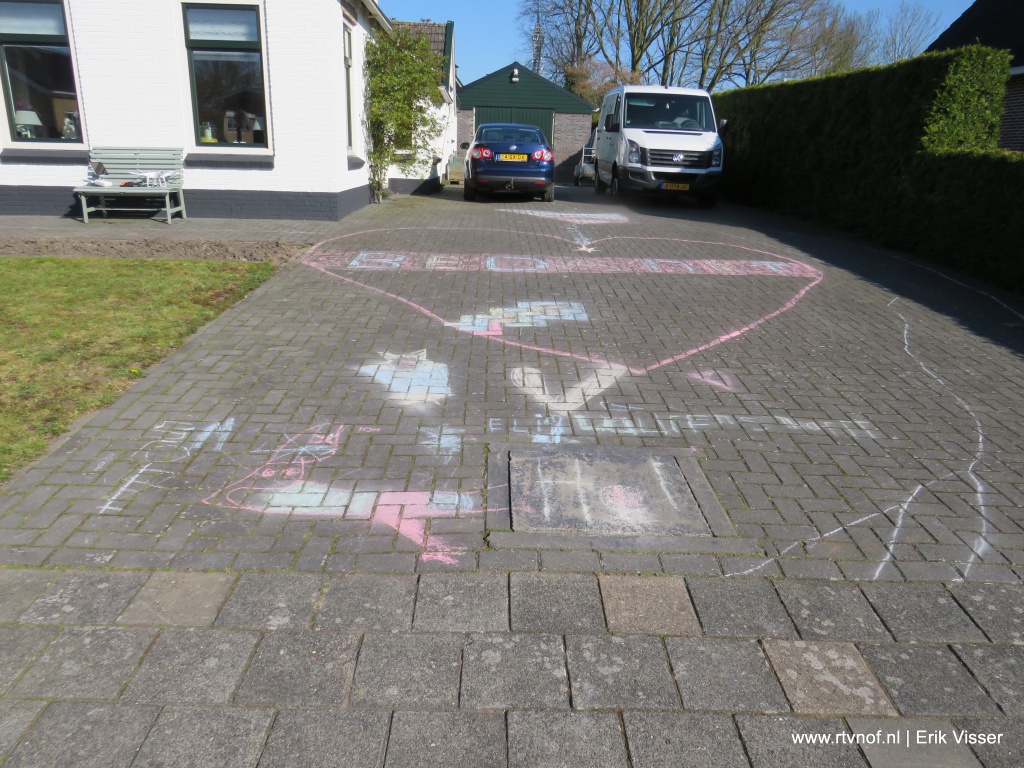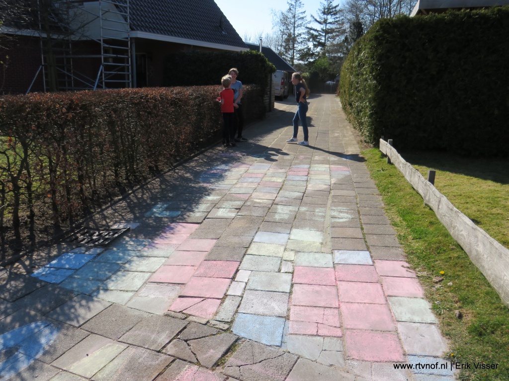 Afgelopen weekend kon iedereen van de Ferlinge Stasjonsstrjitte in De Westereen bij hun eigen woning hun stoep en opritten beschilderen of mozaïeken met stoepkrijt. Hierbij konden ze aan iedereen de groeten doen aan bijvoorbeeld pake en beppe, klasgenoten, coronapatiënten, zorgverleners of vrienden die nu geen bezoek kunnen ontvangen.