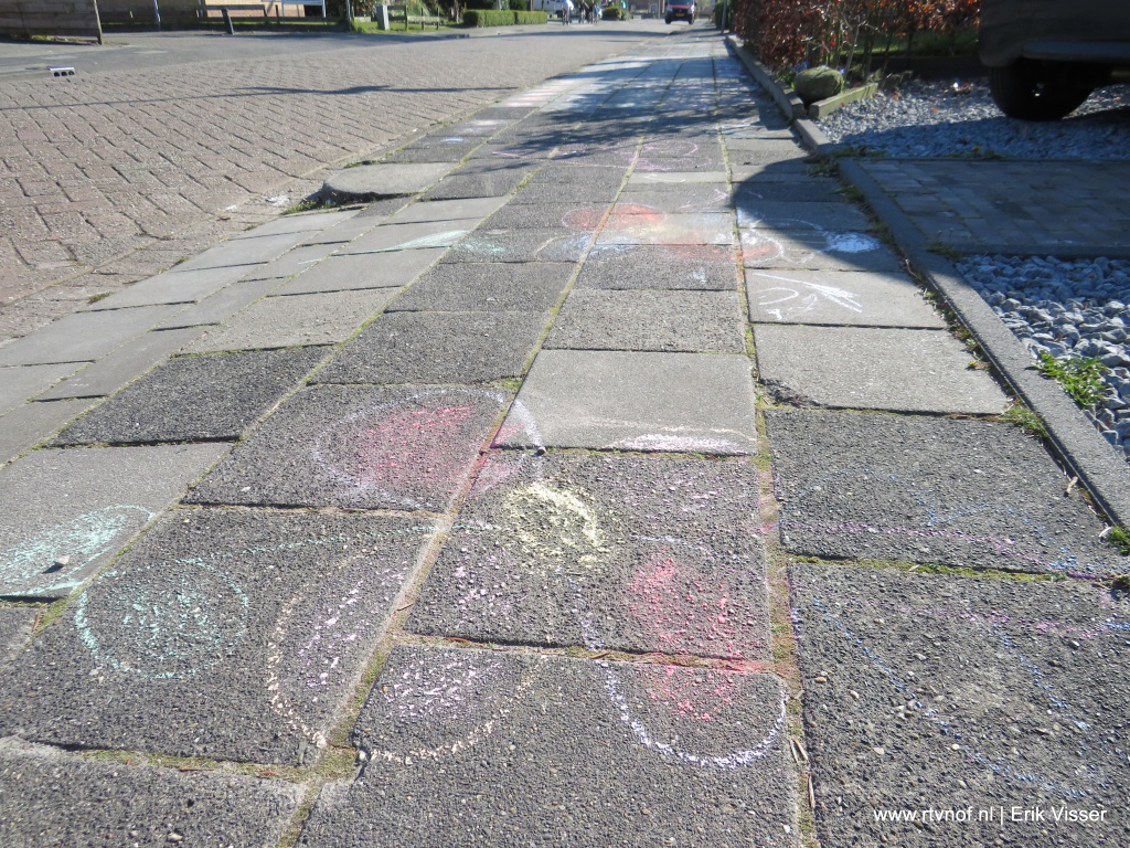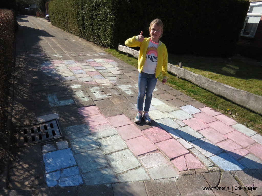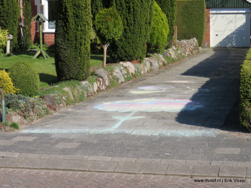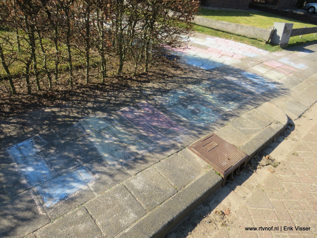 Afgelopen weekend kon iedereen van de Ferlinge Stasjonsstrjitte in De Westereen bij hun eigen woning hun stoep en opritten beschilderen of mozaïeken met stoepkrijt.