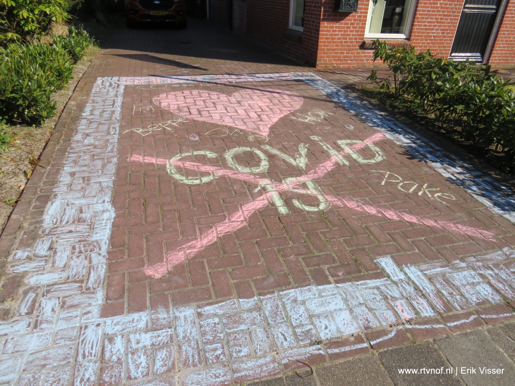 Hierbij konden ze aan iedereen de groeten doen aan bijvoorbeeld pake en beppe, klasgenoten, coronapatiënten, zorgverleners of vrienden die nu geen bezoek kunnen ontvangen. Enkele bewoners waren aanwezig met een drone en vlogen over de ‘Lange Loane’ in De Westereen om de straatkunsten en groeten te filmen.
