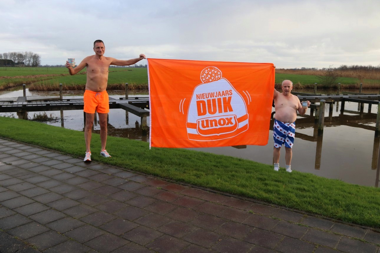 BURUM – Dit jaar werd de traditie van de Nieuwjaarsduik in Burum vanwege corona kleinschalig voortgezet door twee echte die-hards: Renze Poortinga, die voor de 23e keer meedeed, en wethouder van de gemeente Noardeast-Fryslân Jelle Boerema, die in Burum woont en voor de 22e keer meesprong.