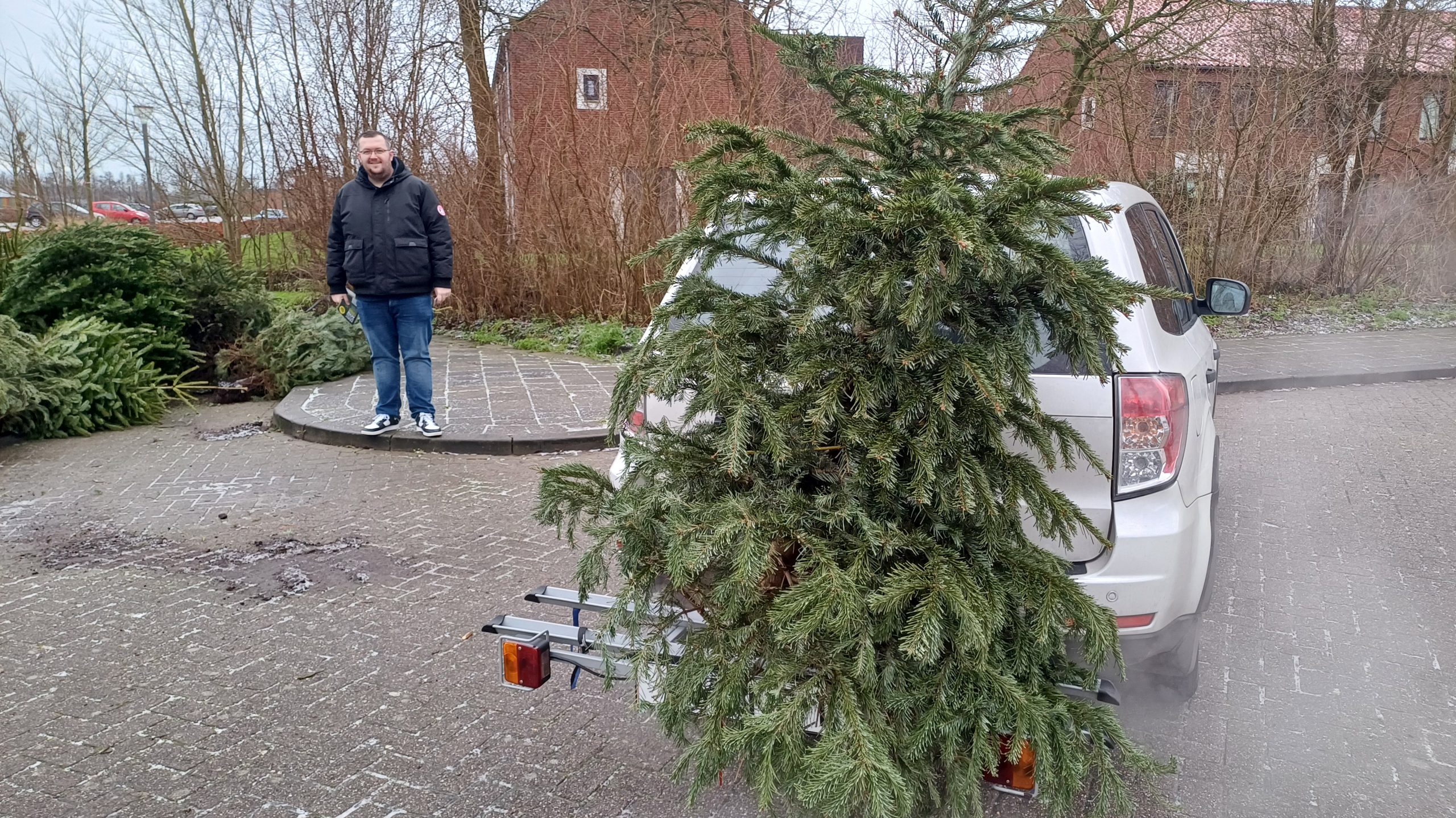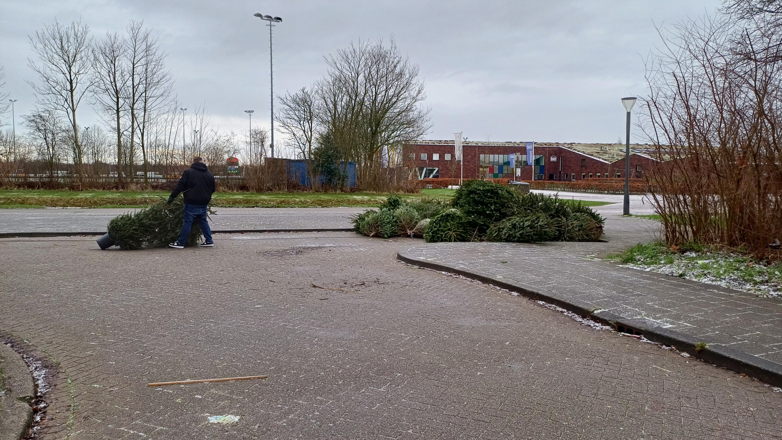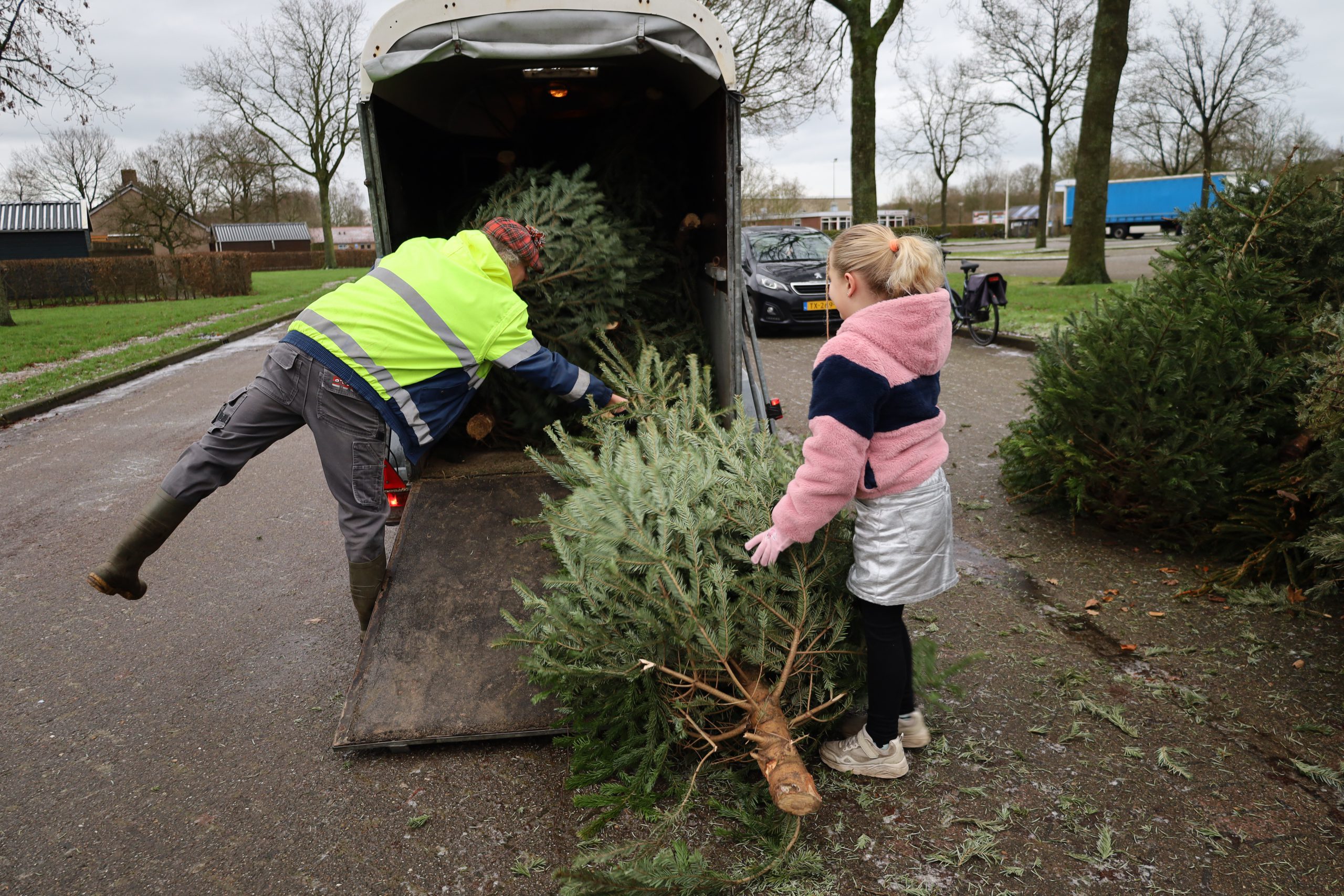 Inzameling van kerstbomen op het parkeerterrein bij v.v. De Wâlden in Damwâld. Foto: RTV NOF | Koos Scherjon