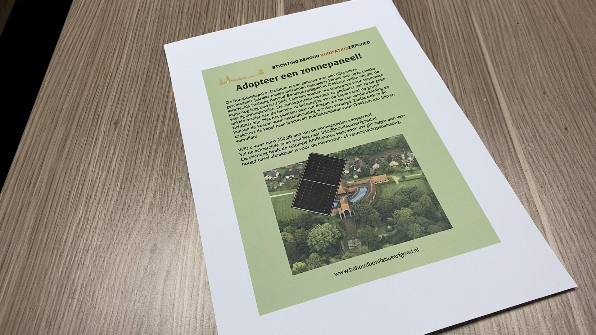 DOKKUM – De Stichting Behoud Bonifatiuserfgoed heeft een oproep gedaan aan geïnteresseerden om zonnepanelen te adopteren voor de kapel in Dokkum.