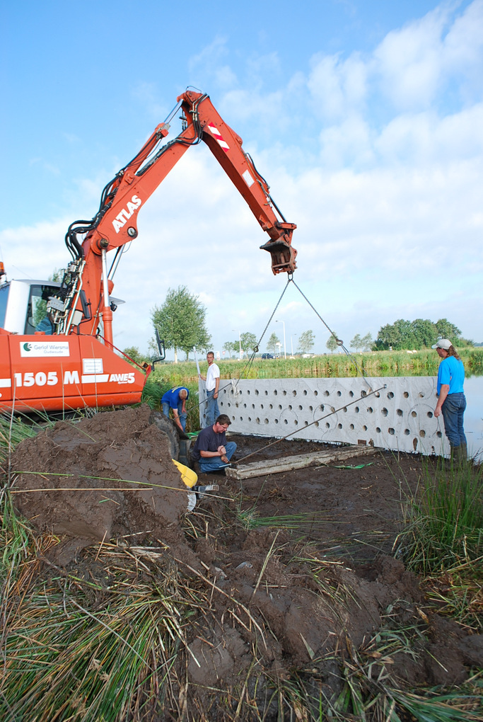 Op de zaterdagochtend is een mobiele kraan plaats gemaakt voor de wand. Hierna konden de onderliggers geplaatst worden en daarna de wand. Deze wand wordt op de achterkant aangevuld met leemhoudend zand waar de zwaluwen hun gang in graven voor een broed plek. Door leemhoudend zand te gebruiken wordt voorkomen dat deze gangen instorten. De oeverzwaluw maakt een gang van 1 tot 1,5 meter lang.