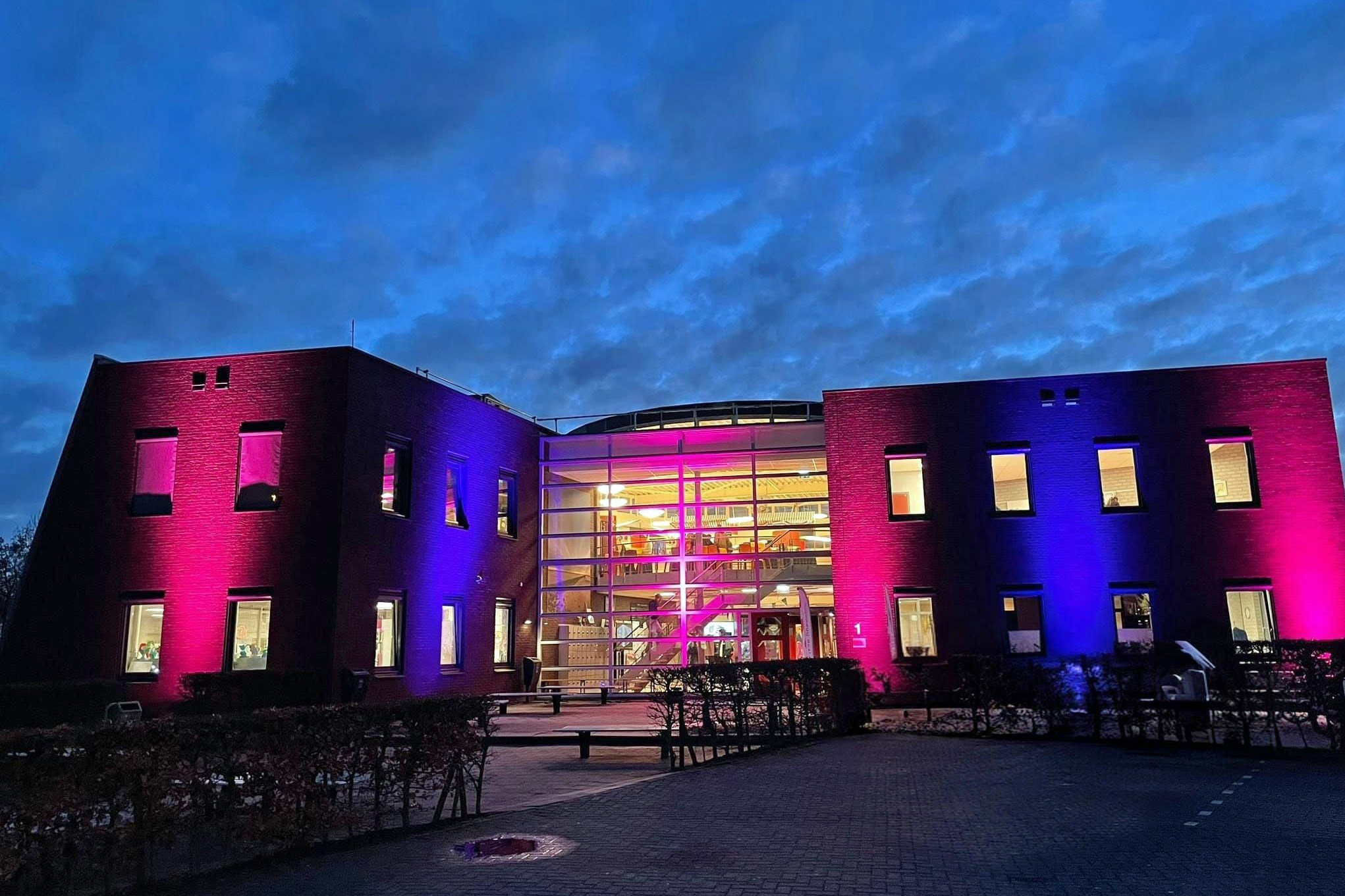 Wie tijdens de open dag even wilde ontspannen, kon terecht op het gezellige horecaplein voor een drankje en een warme hap. Daar ontmoetten ouders, leerlingen en medewerkers elkaar in een ongedwongen setting. Het schoolgebouw aan de Parklaan stond tijdens de open dag letterlijk en figuurlijk in de schijnwerpers. De accommodatie was prachtig verlicht in de kleuren van openbare scholengemeenschap Piter Jelles.