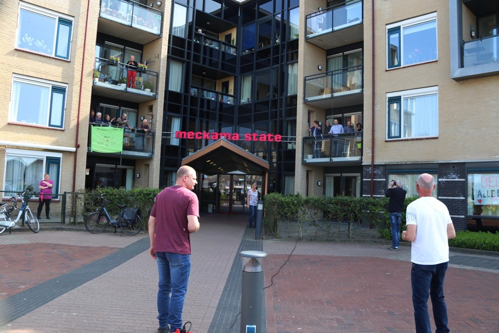 Ook het duo Meester met zangeres Tineke Postma zorgde voor bekende mee zing liedjes. Met mobiele installatie ging men een rondje om Meckama. Voor de bewoners was dit een hele afleiding wat zeer gewaardeerd werd. Na afloop werd iedereen bedankte met een daverend applaus. Door het mooie weer was het volop genieten.
