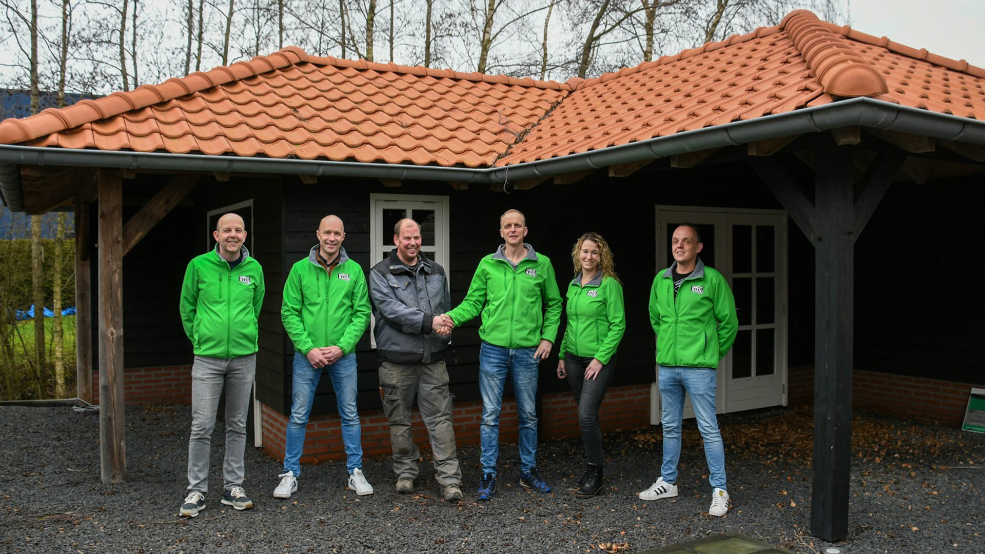 Fotobijschrift: v.l.n.r.: Peter de Vries, Feiko van der Meulen, Tjipco Gommers (Gommers Houtbouw), Hans Feenstra, Jantje Feenstra, Jaap Algra