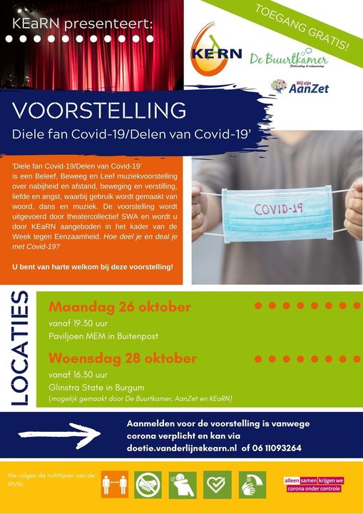 BUITENPOST – KEaRN presenteert in samenwerking met De Buurtkamer en Stichting AanZet de voorstelling ‘Diele fan Covid-19/Delen van Covid-19′. Dit is een Beleef, Beweeg en Leef muziekvoorstelling over nabijheid en afstand, beweging en verstilling, liefde en angst, waarbij gebruik wordt gemaakt van woord, dans en muziek. De voorstelling wordt uitgevoerd door theatercollectief SWA en wordt u door KEaRN aangeboden in het kader van de Week tegen Eenzaamheid. Hoe deel je en deal je met Covid-19?