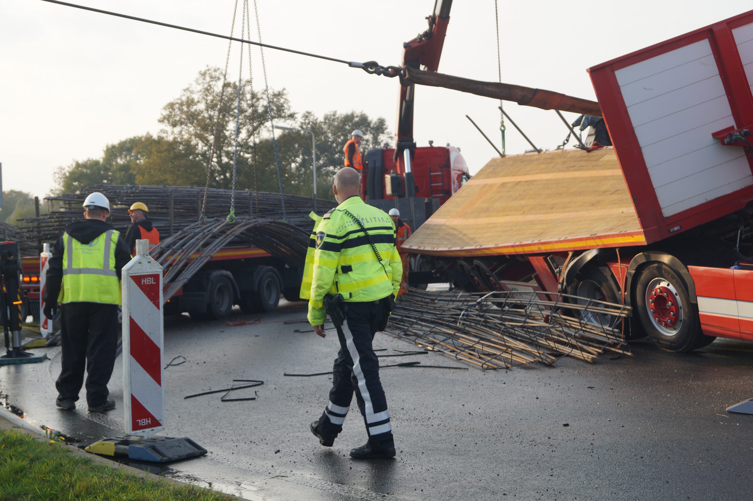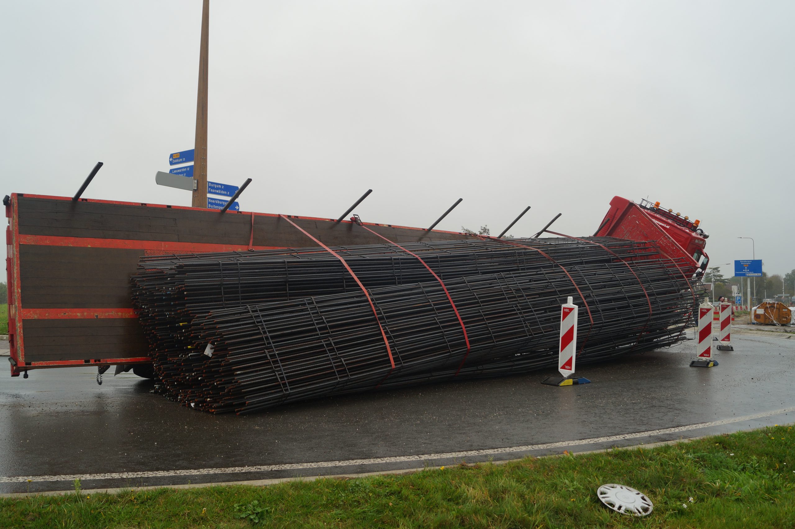 NOARDBURGUM – Een vrachtwagen geladen met staal is dinsdagmiddag gekanteld op de rotonde bij Quatrebras. Waarschijnlijk is de lading gaan schuiven waardoor de vrachtwagen is gaan kantelen.