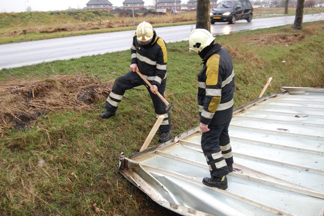 Donderdagmiddag rond drie uur heeft een vrachtwagen zijn dak van de laadruimte verloren op Lutjepost in Buitenpost. Vermoedelijk door de harde wind werd het dak van de wagen getild en in de naastgelegen sloot geklapt. De vrachtwagenchauffeur heeft vermoedelijk niks gemerkt en heeft zijn weg gewoon vervolgd. De chauffeur wacht nog een verrassing als die met z’n lading op bestemming komt.