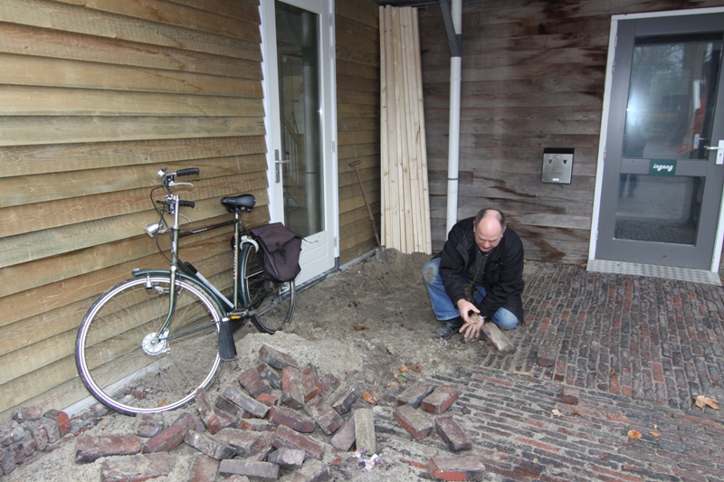 Het aanbrengen van isolatie en dubbele lagen bekleding van de wanden zorgen ervoor dat het nieuwe gebouw op en top geïsoleerd wordt. Op de begane grond is Rienk van der Beek druk met het schilderen van de trappenhal, Andries Hofstra is bezig met het afmonteren van het elektrisch en Eedse Nicolai zorgt er voor dat de bestrating bij de ingang ook weer op orde wordt gebracht.