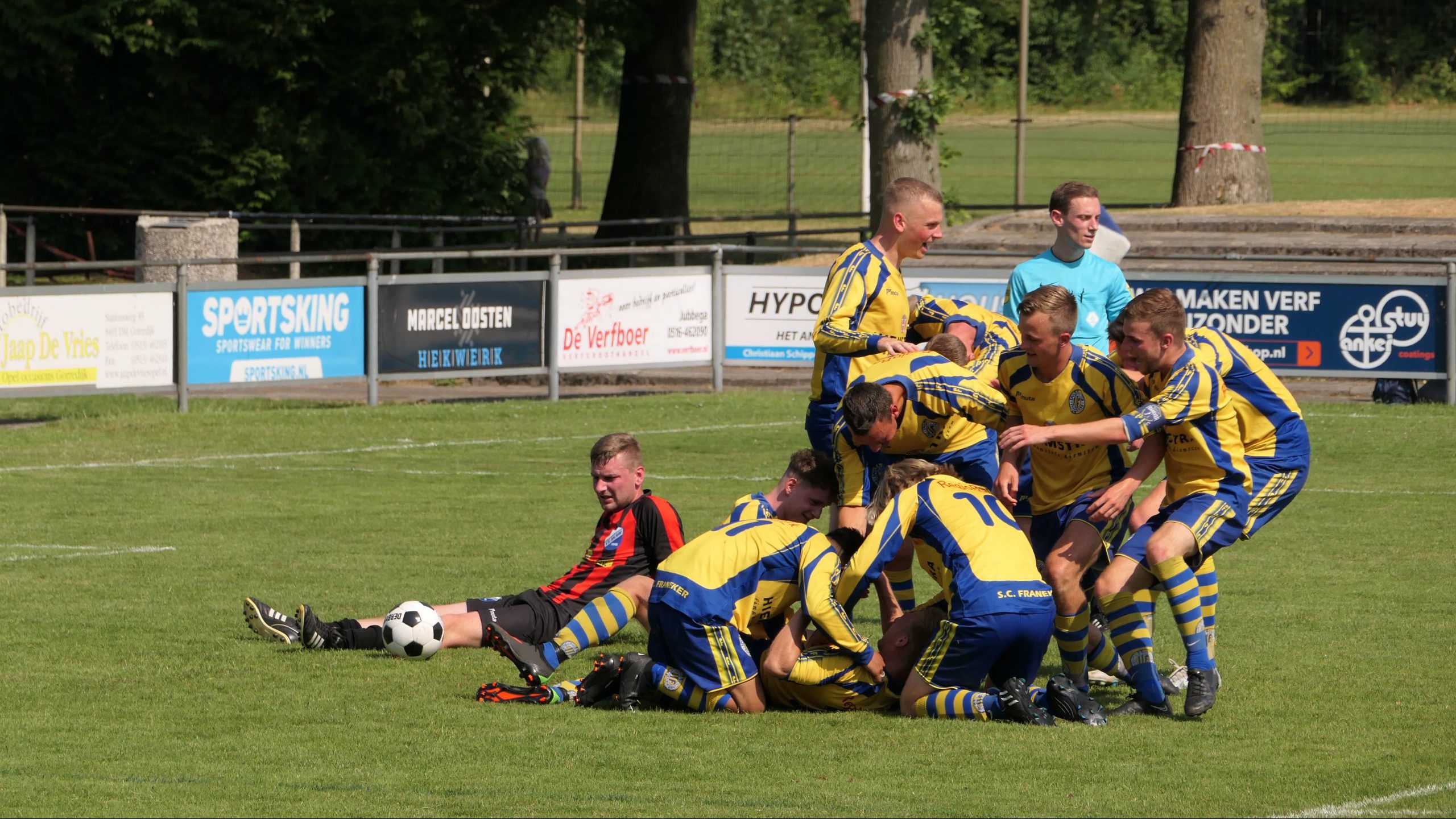 De gasten uit Franeker promoveren uiteindelijk toch naar de derde klas. Wat via de reguliere kompetitie net niet lukte, daar slaagden de manschappen van Johannes Veenema wel in tijdens het “toetje” . Ook vanuit het Anjum kamp van harte proficiat en veel succes toegewenst een stapje hogerop in de derde klas. De wedstrijd werd zaterdagmiddag gespeeld op een zonnig sportpark Kortezwaag te Gorredijk. Voor velen was dit een eerste kennismaking met dit fraaie sportcomplex. Onbekend maakt zeker niet onbemind. Zowel op het veld, er was regelmatig gesproeid, als langs de lijn hadden de gastheren de zaakjes prima voor elkaar! Een compliment derhalve aan het adres van v.v.Gorredijk voor de prima ontvangst en goede zorgen!