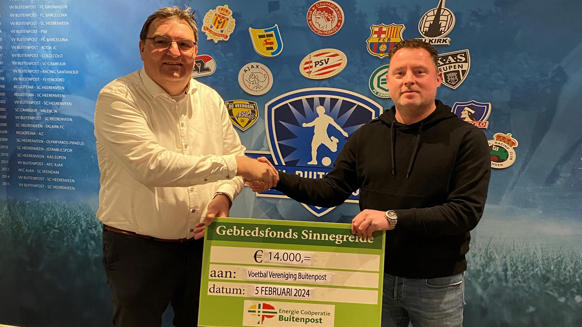 BUITENPOST – VV Buitenpost is bezig de accommodatie verder te verduurzamen. Gebiedsfonds Sinnegreide, dat duurzame initiatieven in Achtkarspelen steunt, helpt de voetbalclub met de energietransitie en stelt hiervoor 14.000 euro beschikbaar. Maandagavond heeft bestuurslid Sean Thompson van Sinnegreide een cheque overhandigd aan penningmeester Rudi Stuursma van VV Buitenpost.