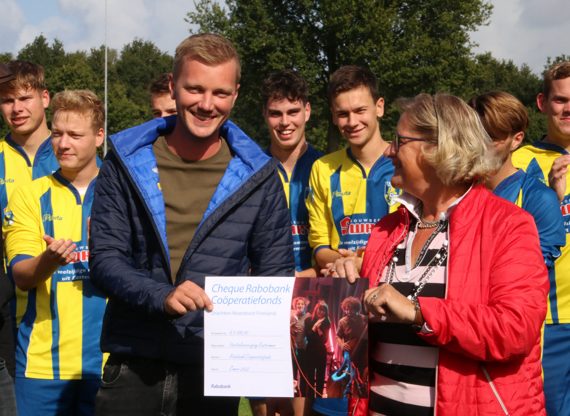 EASTERMAR – Op zaterdag 17 september jl. mocht VV Eastermar een cheque van 5.000 euro in ontvangst nemen vanuit het Fonds Coöperatief Dividend Rabobank. De cheque werd uitgereikt door Conny van Eijden, van de Ledenraad Rabobank. De bijdrage is bestemd voor de realisatie van duurzame ledverlichting boven de velden.