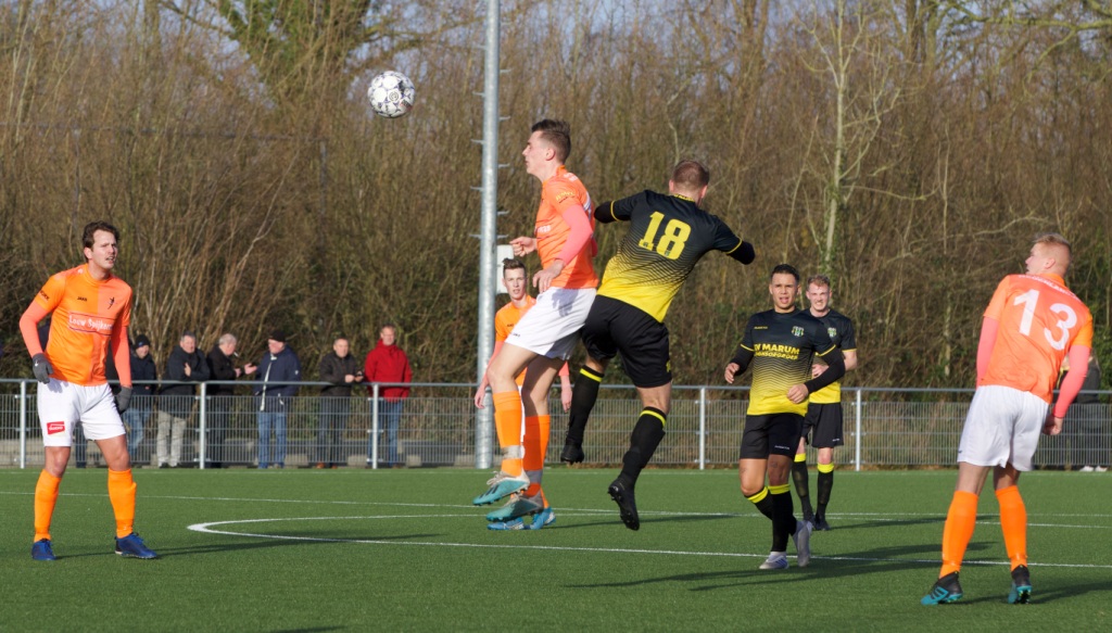 De Oranjehemden stelden hier weinig tot niets tegenover en in de vierde minuut leverde dit al de openingstreffer op voor de Marumers. Slordig balverlies van routinier Henstra aan Kollumer zijde zorgde er voor dat Rick Buma bij de eerste paal, ook doordat er verzuimd werd deze fout te herstellen, binnen kon werken. Die 1-0 achterstand was een flinke domper voor de gasten, die dat ook niet meer te boven kwamen, zo zou blijken. De ploeg straalde bijna de gehele wedstrijd geen geloof uit dat er een resultaat behaald zou kunnen worden. Hoe anders was dit bij de thuisspelende ploeg. Deze zette na de genomen voorsprong nog maar eens extra aan, wat na een kwartier spelen bijna tot een verdubbeling van de score leidde. Aanvoerder Jordy Swieringa zag zijn inzet echter rakelings langs de voor hem verkeerde kant van de paal verdwijnen.