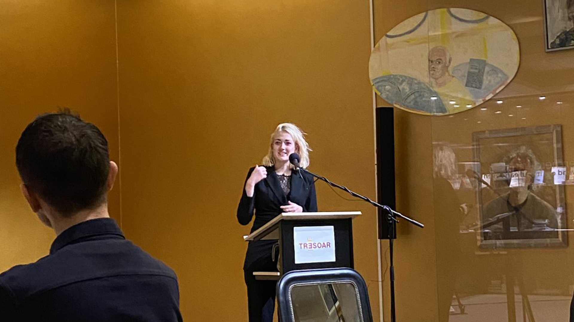 Foto 2: Sannemaj Betten draagt Wjerspeglje gedicht voor op de Verhalenavond