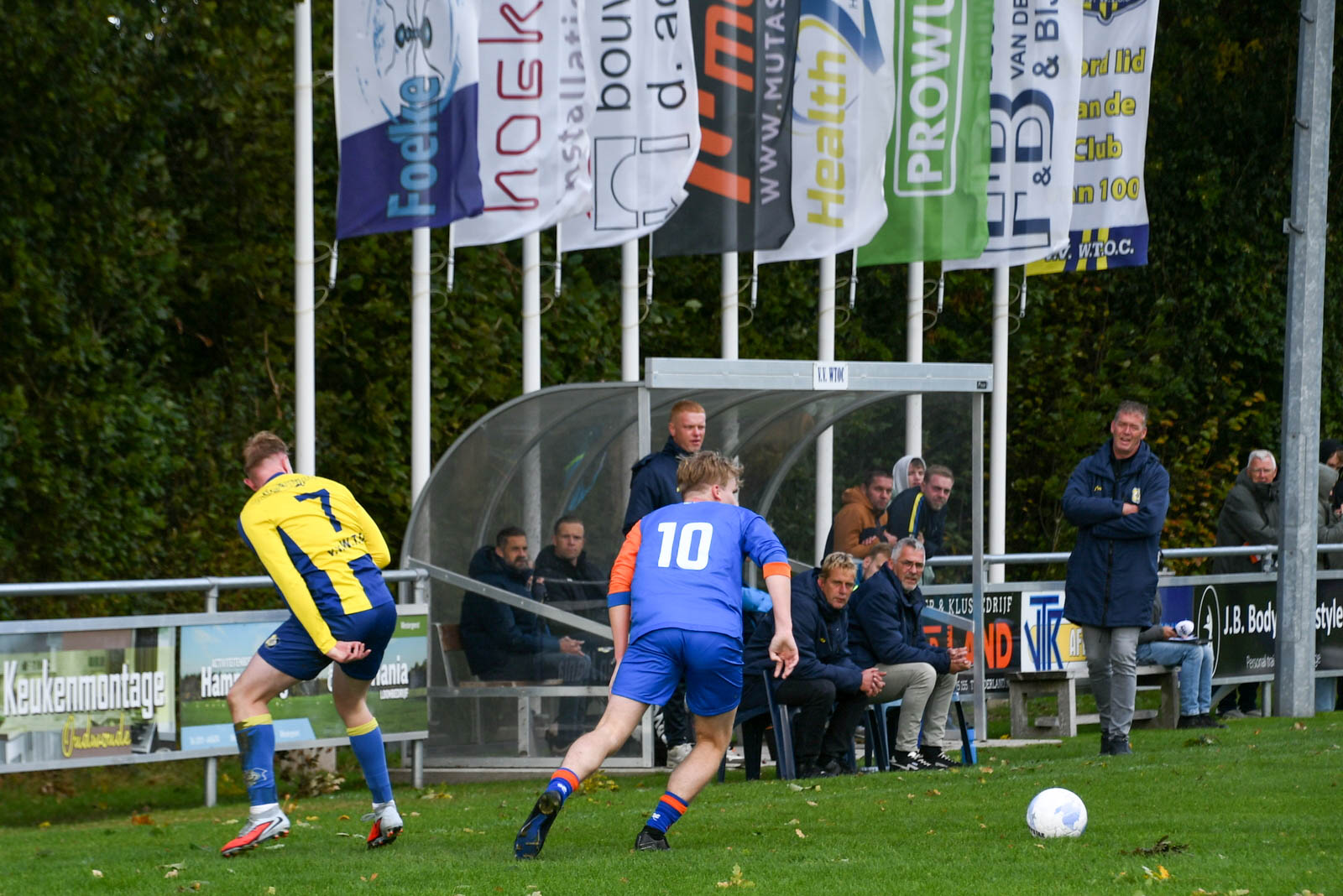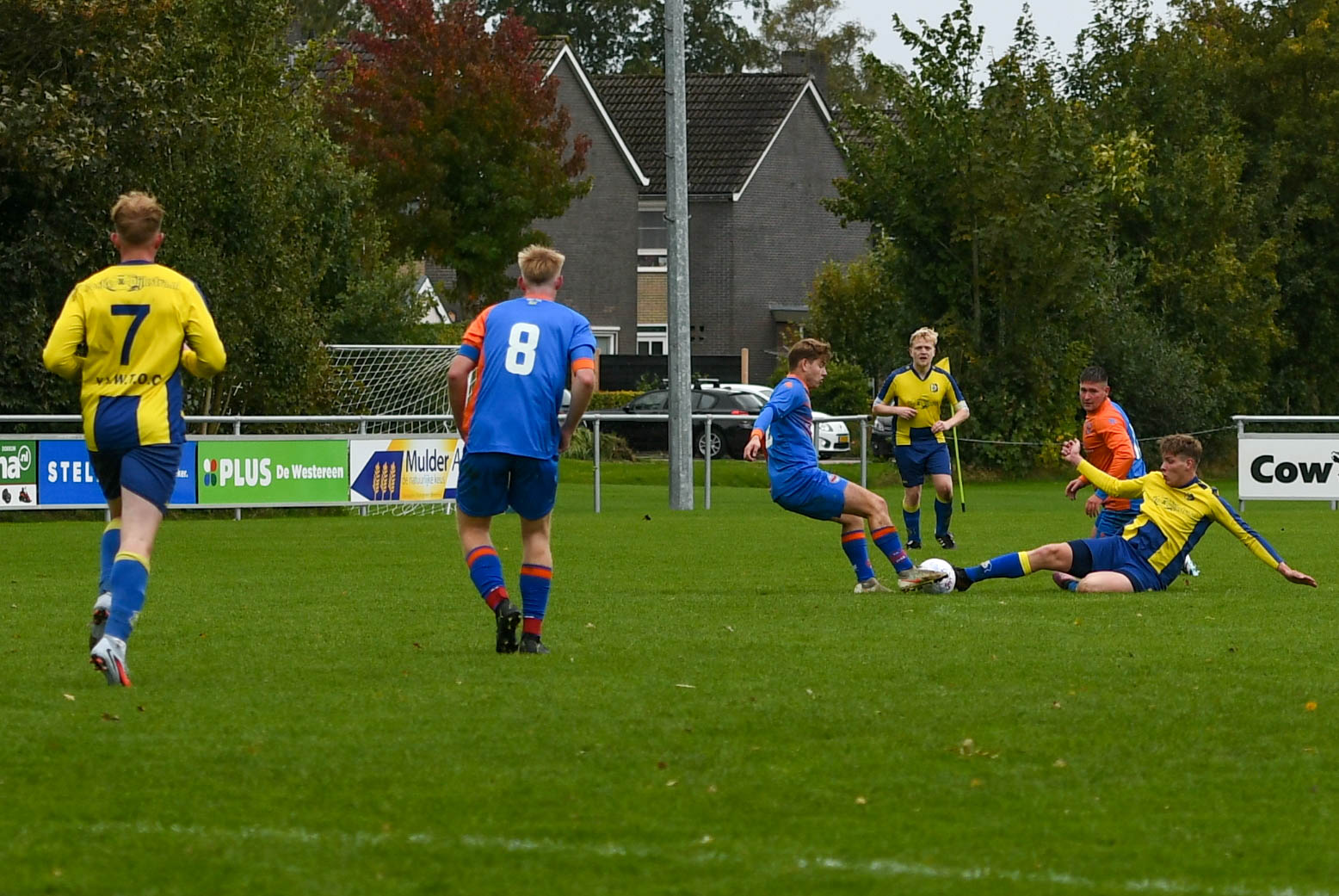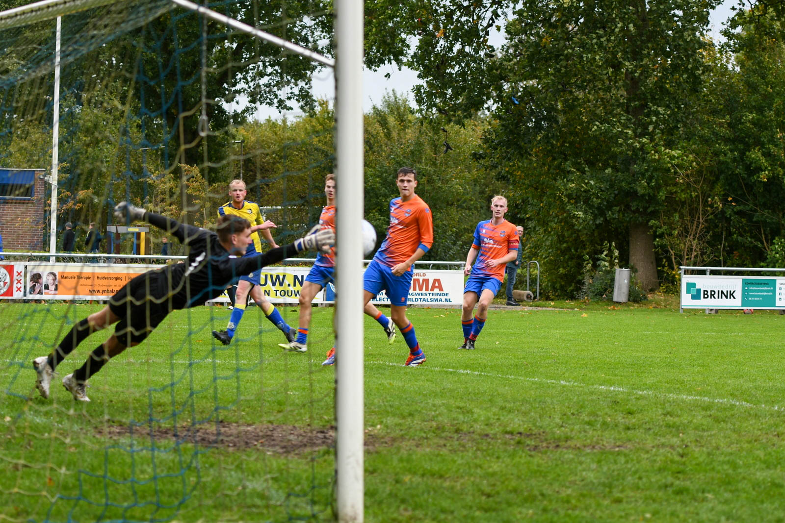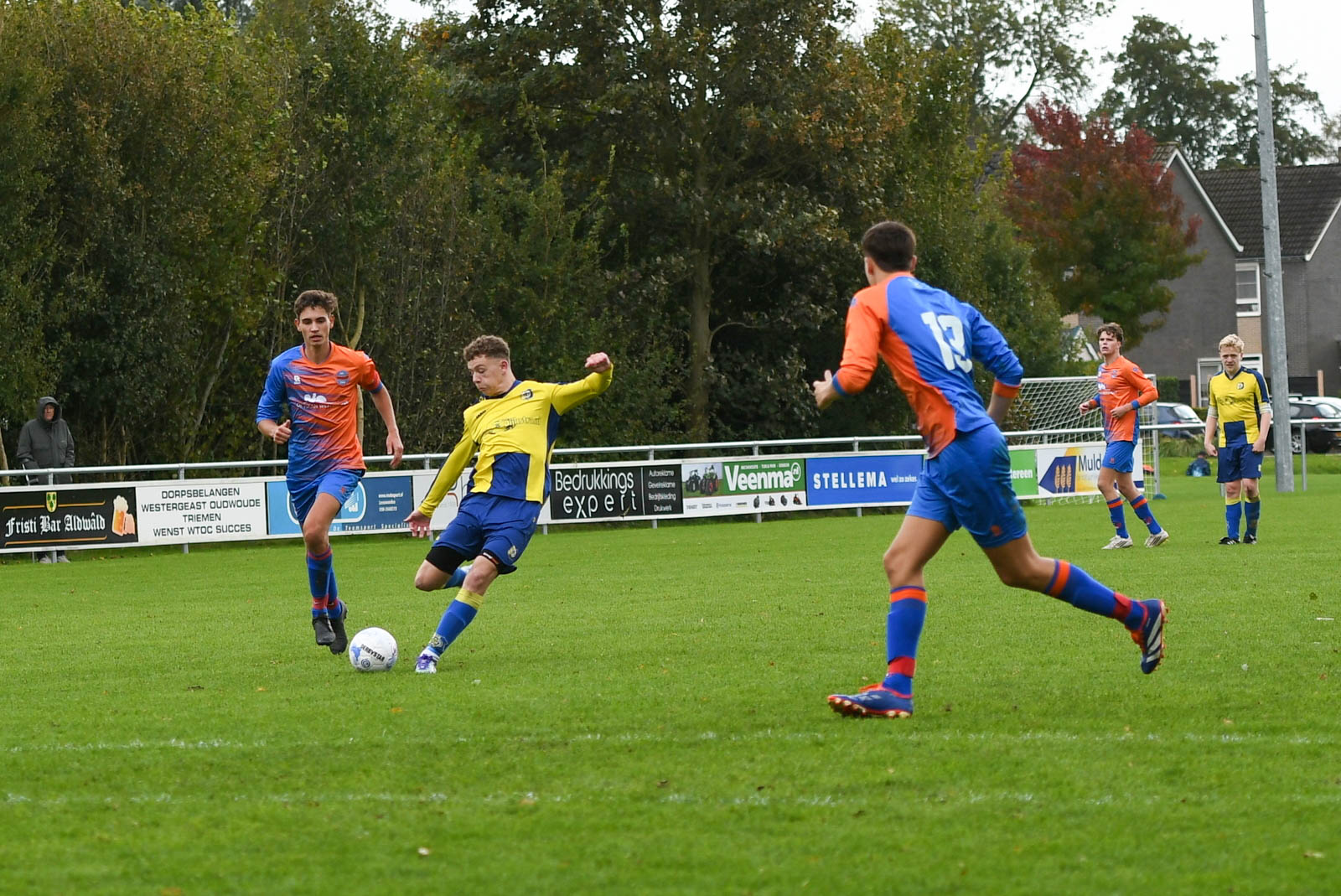 ALDWALD – Onder stormachtige omstandigheden werd zaterdagmiddag afgetrapt voor het competitieduel WTOC – Drogeham. De thuisclub kwam fel uit de startblokken en zette de bezoekers vast op eigen helft. Al na 5 minuten kon de goalie van Drogeham de bal uit het net vissen. Een schot van Jelmer Castelein werd niet goed verwerkt door de keeper waarna de doorgelopen Nyckele Smeding de bal simpel kon intikken.