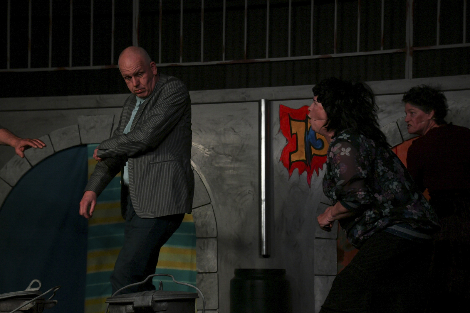 Een mooie volle Bazuin genoot van de wijze waarop de spelers hun rol neerzetten. Het stuk gaat over Frederik en Isabel, die ruzie hebben over de bruiloft. Op perron 12 gooit Isabel de ring over de reling naar perron 13 en is daarna verdwenen. Daar heeft een zwerver mogelijk de ring gevonden. Onder de brug wonen namelijk ”âlde Arie en bline Ronny”, Rita en Vanessa, twee onbetrouwbare bedelaars, en de hoogzwangere Suzy. Daarna speelt zich heel veel af op dit perron. De ring werd gevonden, maar is ook snel weer zoek. De politie en de gemeenteambtenaar worden er zelfs bij betrokken. En de vraag is, komt de ring terug bij Isabel en kan de bruiloft doorgaan? “Bline Ronny” is dan wel blind, maar zijn gehoor is prima en Arie en Ronny zijn erg behulpzaam bij het zoeken naar de ring en wat er zich verder afspeelt.