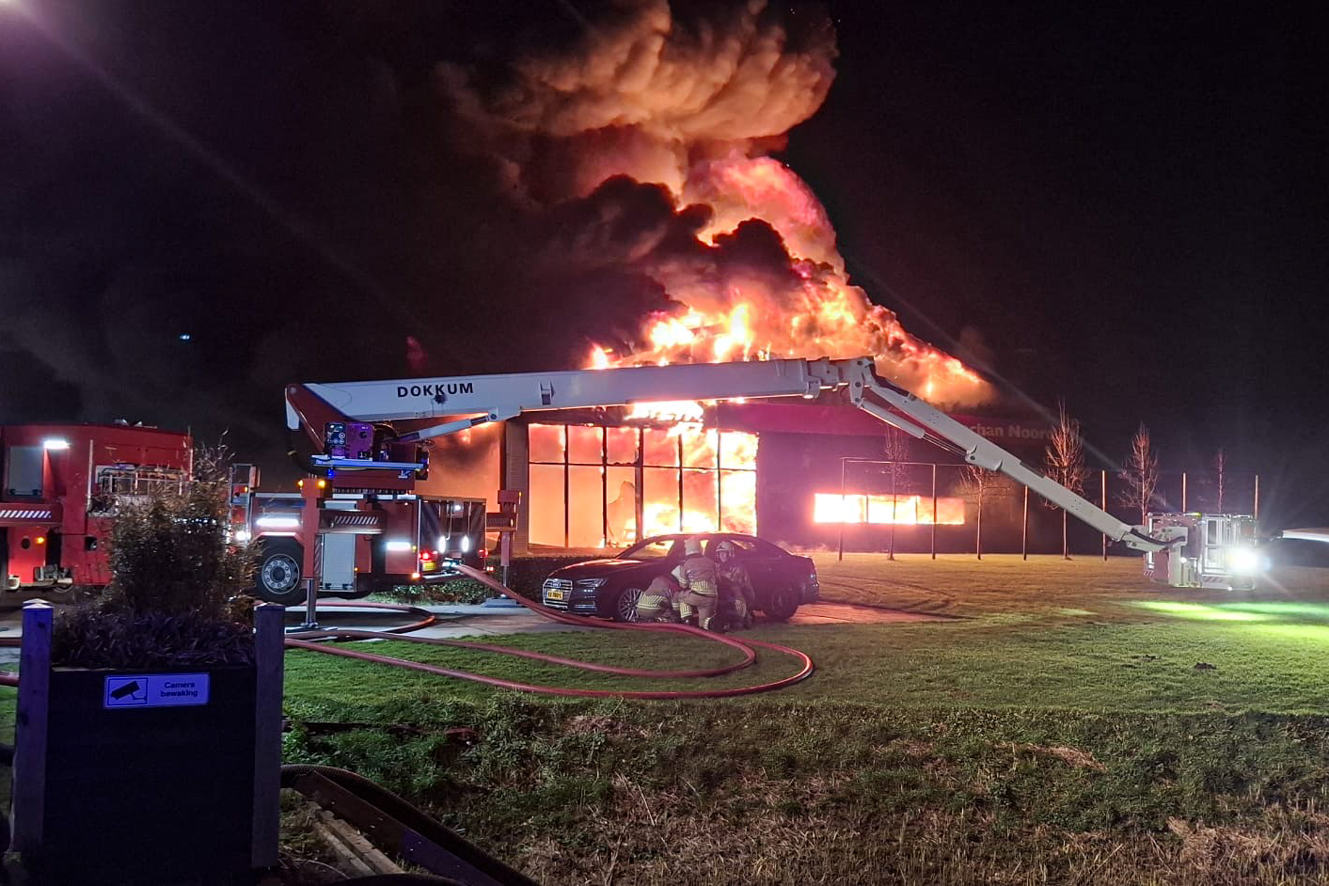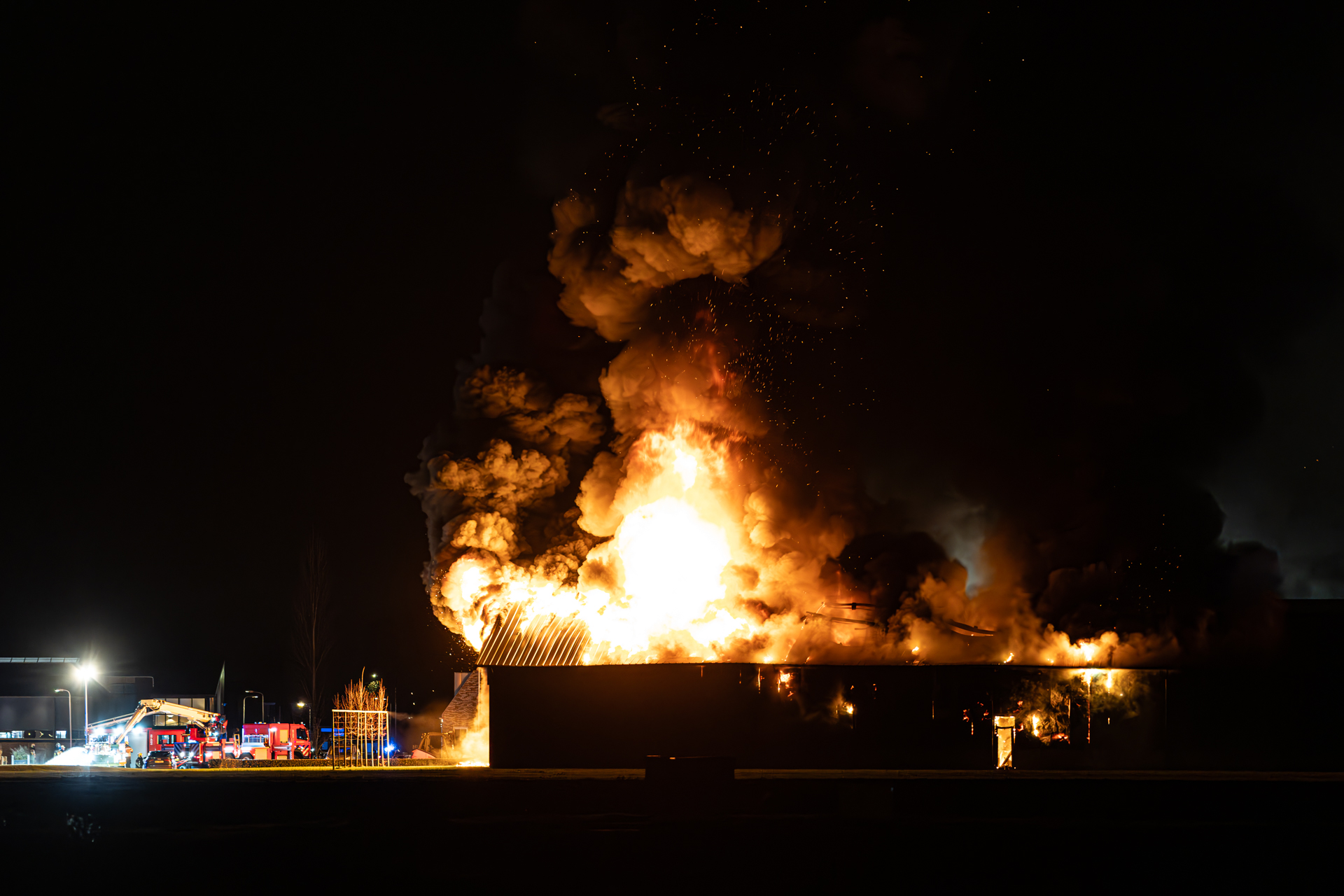 Bij de brand kwam veel rook vrij, wat leidde tot het versturen van een NL-Alert. In het bericht werd geadviseerd: “Sluit ramen en deuren. Zet ventilatie uit. Blijf op afstand. Geef hulpdiensten de ruimte.” Toen de hulpdiensten arriveerden, stond het gebouw al volledig in brand. Ontploffende gasflessen veroorzaakten harde knallen, wat het bluswerk bemoeilijkte. Om de samenwerking tussen verschillende hulpdiensten te verbeteren, werd de brand opgeschaald naar een GRIP 1-situatie. Meerdere ploegen uit de directe omgeving werden ingezet om de brand te bestrijden, zoals Dokkum, Kollum, Ternaard, Buitenpost, Leeuwarden en Burgum.