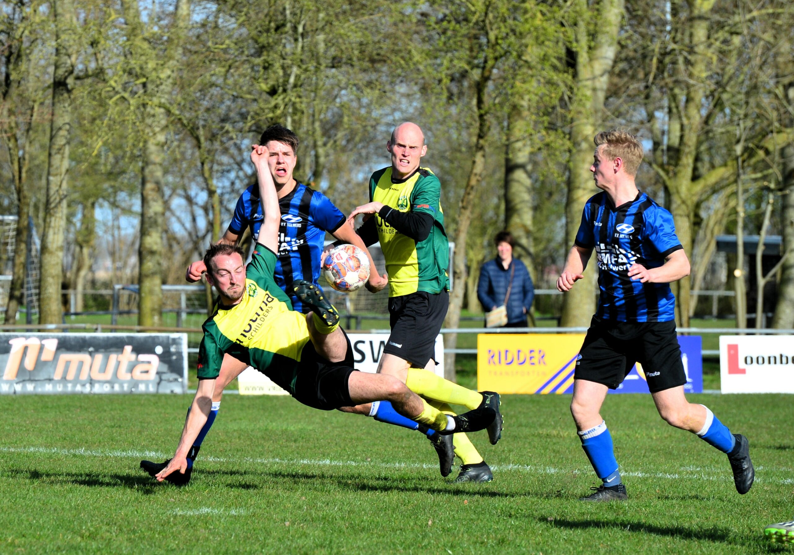 HOLWERT – Onder een waterig zonnetje met een straffe wind over het veld in Holwerd werd de derby tussen Holwerd en Ropta Boys gespeeld op sportpark de Morgenzon. Het veld was lastig bespeelbaar, dit was goed zichtbaar aan beide kanten in het vertoonde spel. Ropta Boys had een licht overwicht maar ging na zesennegentig minuten in mineur van het veld omdat scheidsrechter Hamstra besloot om het doelpunt van Holwerd in de drieënnegentigste minuut goed te keuren terwijl de grensrechter al geruime tijd de vlag omhoog hield vanwege buitenspel.